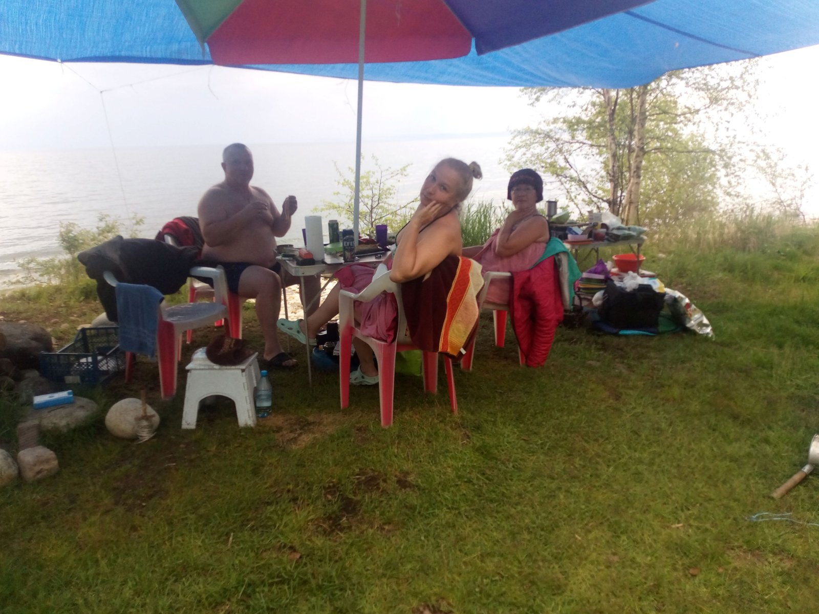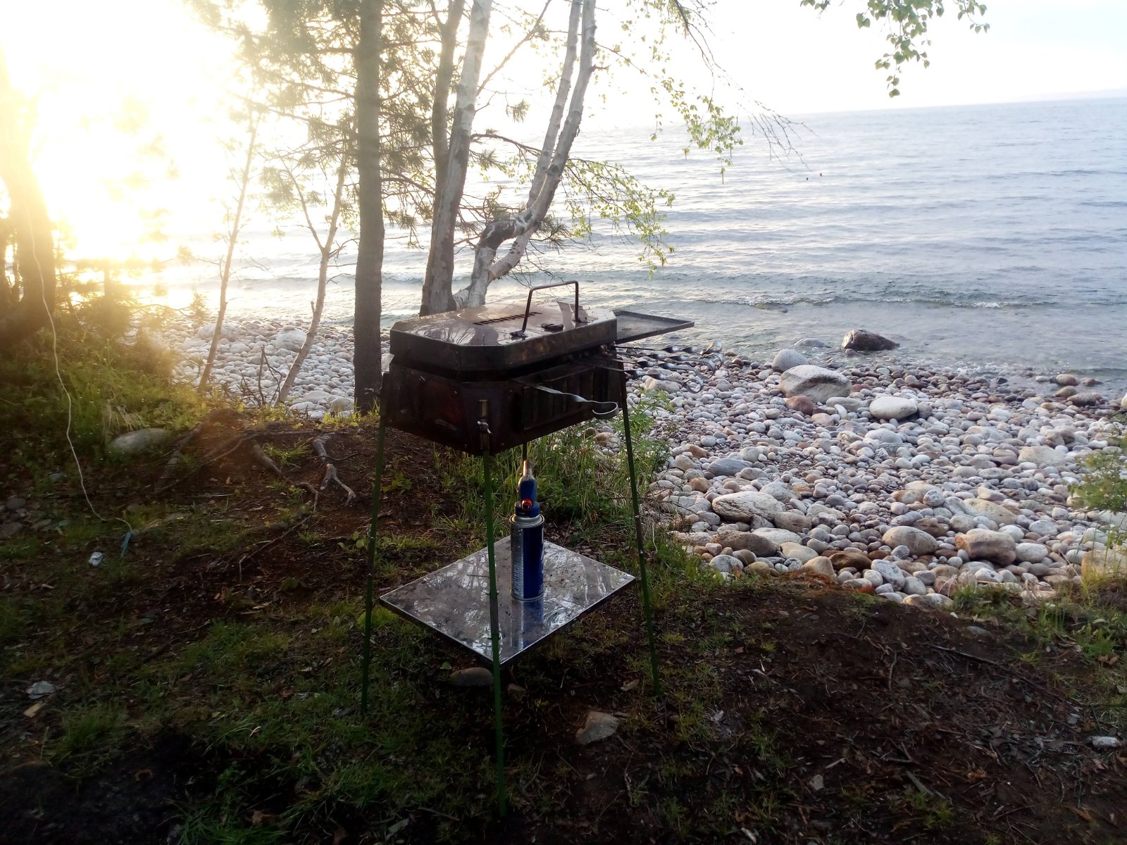 Итак, мы вчетвером в прошлогоднем составе. Народу в Мурино, на удивление, немного. Выбрали для лагеря небольшую тупиковую поляну в кедраче и довольно густых зарослях, но при этом на самом берегу. Обработали саму поляну, одежду, машины и палатки от клеща. По приезду было солнечно, тепло и относительно безветрено. Даже САПы плавали Байкал в этот раз относительно чистый. Воду для кипячения брали прямо с берега, за питьевой уходили на лодке метров на 200. Однако, Байкал на то и Байкал, чтобы менять погоду по 20 раз за день, причём очень резко. Сначала налетел штормовой ветер. Синий китайский тент оторвался с десяти растяжек, перевернул зонт и стол со всем содержимым. Мобибы стояли, как памятники. Потом, как из душа хлынул ледяной ливень. Баню в первый день топить не планировали, но пришлось.