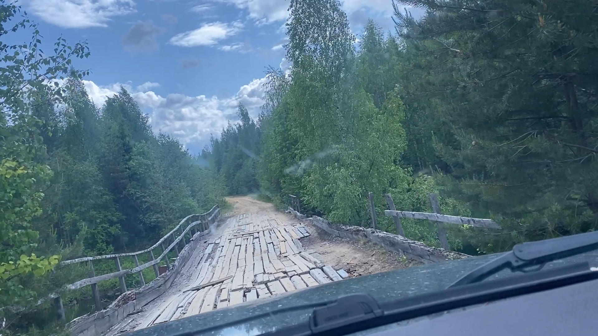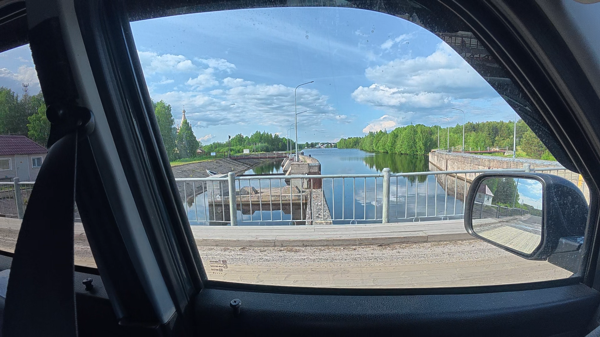 Беломоро-Балтийский канал в этот раз не заставляет ждать на шлюзе битый час, у нас это хорошая примета! При выезде на грунтовку, чтобы не растрясло, травимся с 2,5 до 1,5 Атм, а в овнах вообще до 0,3-0,7 Атм, и Жужа прёт как танк. Дороги у нас, конечно, не для стоковых авто. Мосты заставляют напрягать пятую точку. Пробег около 80 км.