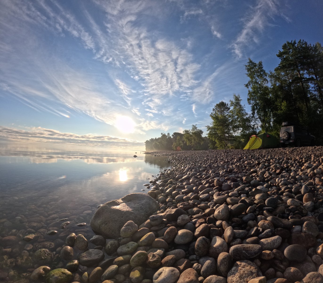 Байкал нас встретил идеальным штилем, хотя по дороге из буддийских храмов Улан-Удэ был дождь и туман. Ночь.Подошли к воде, кричим «привет Байкал» и тут одна единственная волна выплеснулась на камни- девчонки напугались, поздоровался говорю! Вообщем чудеса там.