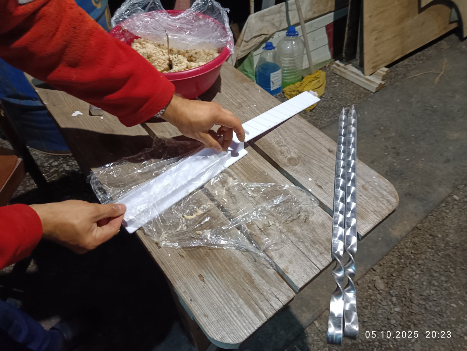 А не сделать ли нам завтра люля-кебаб, решили мы. На следующий день обещали мелкий дождь, поэтому мангал затащили под навес. Жена подарила приспособу для формирования люля-кебаб, ей и пользовались. Ещё я купил под люляшки широкие шампура.