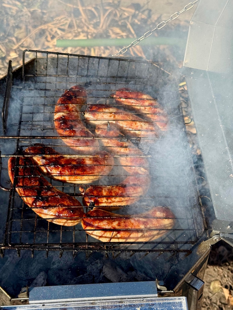 Половины мешка березового угля, т.е около 1.5 кг, хватило пожарить 2 закладки стейков и закладку колбасок, оставшегося в мангале угля хватило бы еще минимум на закладку.