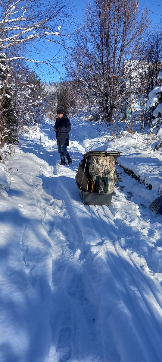 В аккурат все поместилось на одни санки, хоть и с явным перегрузом. Но чуть больше барахла - и уже пришлось бы делать пару рейсов. И не сказать что далеко, но в горку за 300 метров 7 потов сойдет, а это неправильно - идти в баню уставшим :-D