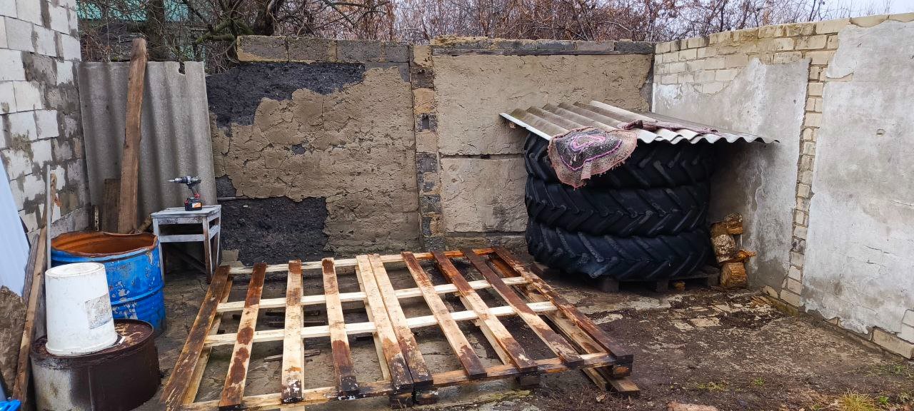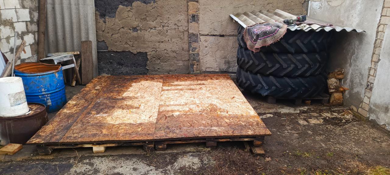 Кстати обратите внимание на тракторные колеса стопкой. Это между прочим импровизированный дровник. Снизу паллеты, чтобы продувалось, сверху шифер от дождя, внутри понятно дрова