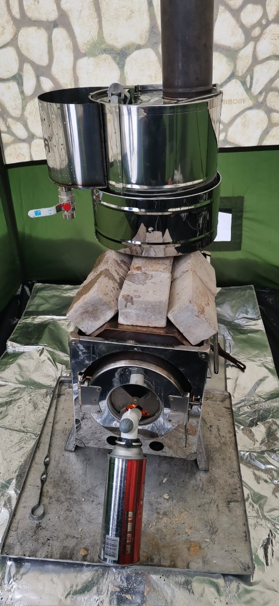 Вода довольно быстро выкипала и уходила на поддачи. Отработал алгоритм, добавил воды, подбросил 2 колотых брикета, пока нагревается, сидим чаи гоняем, отдыхаем.
