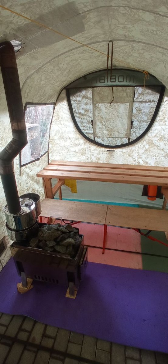 Надо только на палатке два слоя, тёплый пол и топливо сухое, в моём случае брикеты, березовая пыль, колол на 2-3 части, закладывал по 4 5 штук,. Ушло полторы пачки на 3 часа, первая закладка 4 шт, прогрев бани.
