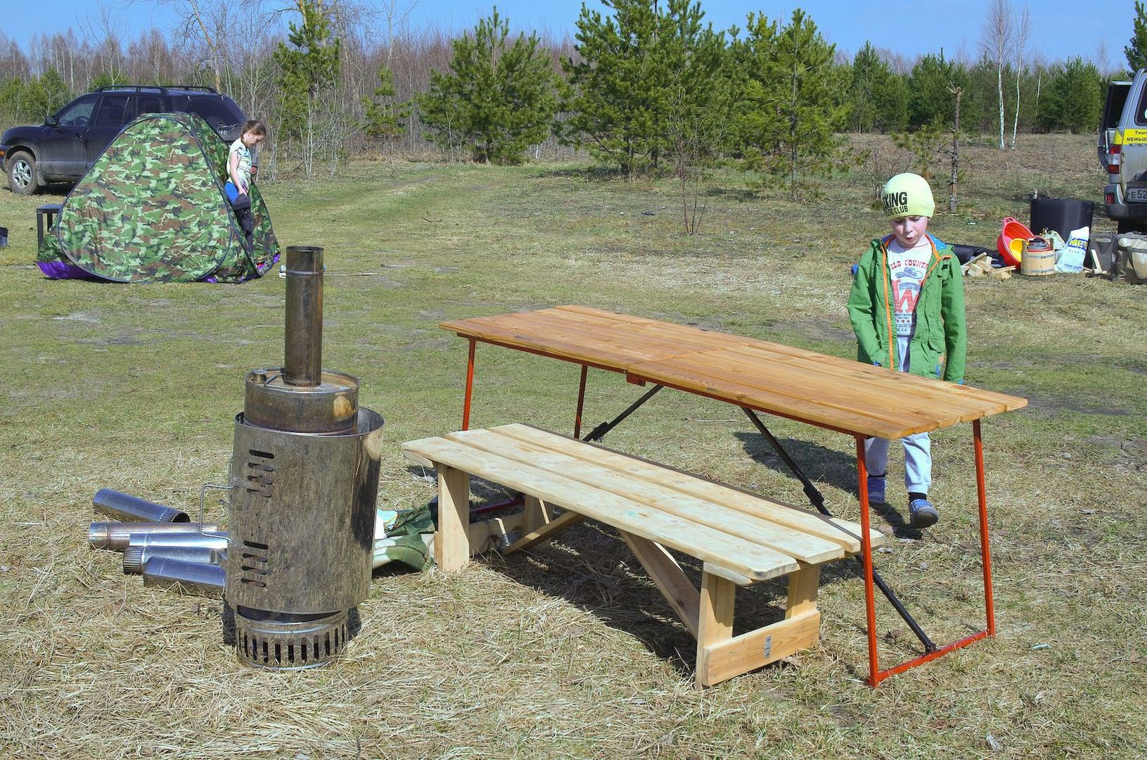 собирается за пару минут, но вот только тяжелый полок вышел просто жесть. компактный, да, но тяжеленный ужасно. взвесить нечем. В целом опыт получился интересный, но вывод для себя я сделал такой - потраченное время лучше бы по специальности подзаработал и на вырученные деньги купил фабричное изделие. Не очень-то сэкономил, а учитывая время - даже прогадал. В дальнейшем так и сделаю и закажу для большой палатки уже пару-тройку кроватей КС-350.