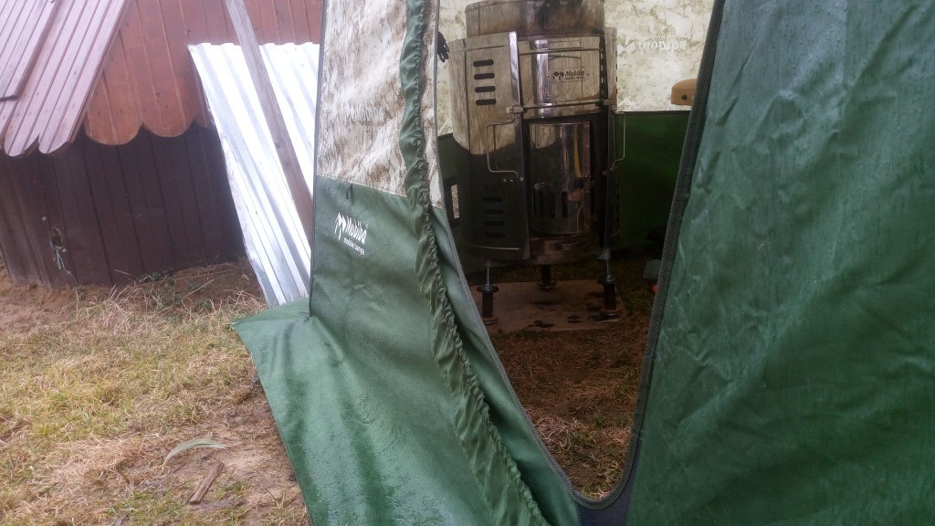 В субботу была дождливая погода, решил московских родственников порадовать. На даче развернули десятку. Заодно испытал свою подставку. Сразу итог. Идея имеет право на жизнь, но требует некоторых конструктивных доработок. Рельеф участка не очень ровный и после установки паробомбы на подставку потребовалась регулировка. Все очень легко и просто даже на уже затопленной и нагруженной камнями печи. Но буду переделывать однозначно. Баня получилась отменная. Дрова были сухая ель, поэтому температура улетала за сотню как то быстро и не принужденно. Пару раз проветривали). Градусник с деревянной основой изогнулся дугой. На крыше еще один прожег образовался. Это с седьмым коленом дымохода. Надо попробовать восьмое поставить.