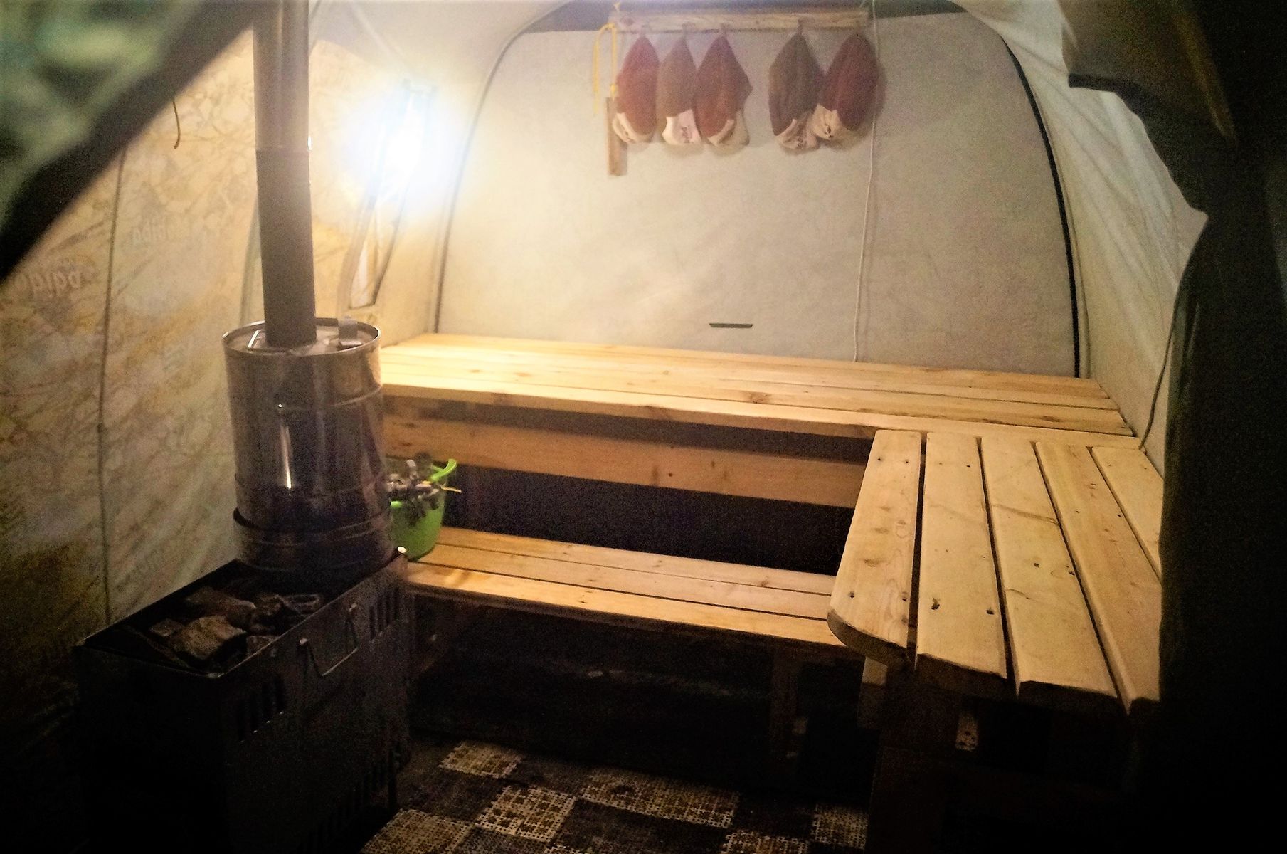 поскольку баня с марта по октябрь будет стоять стационарно, хочу сделать стационарные устойчивые полки по которым можно будет скакать детям без страха завалить всю баню и сделать теплый пол, пол хотел сделать под печкой из тротуарной плитки, а под ногами из экструдированного пенополистирола Пеноплэкс и накрыть его сверху линолеумом или искусственным газоном и поэтому