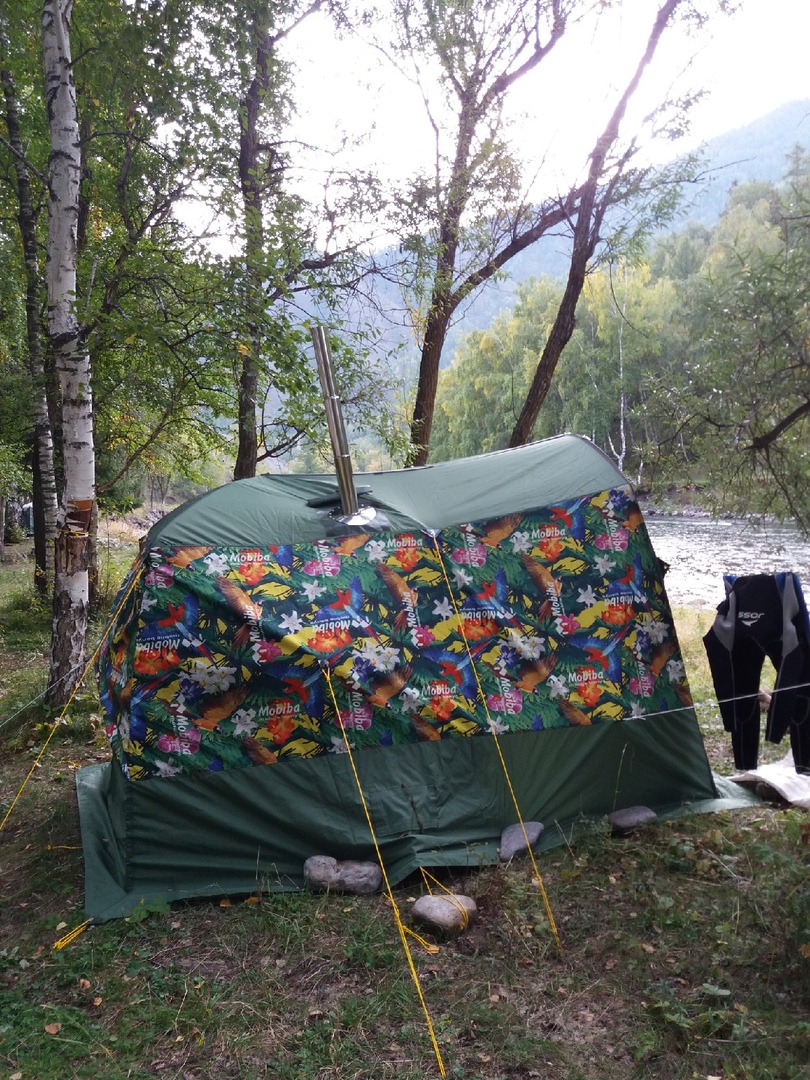 Ещё, по уже сложившейся традиции, привёз на традиционную стоянку на р. Урсул новую баню - К-2. Она ничем принципиально не отличается от предыдущей, но новое всегда приятно. :D Обожгли печь и хорошенько пропарились после осеннего сплава. Водичка в Катуни бодрящая и вечерняя баня пришлась очень кстати.