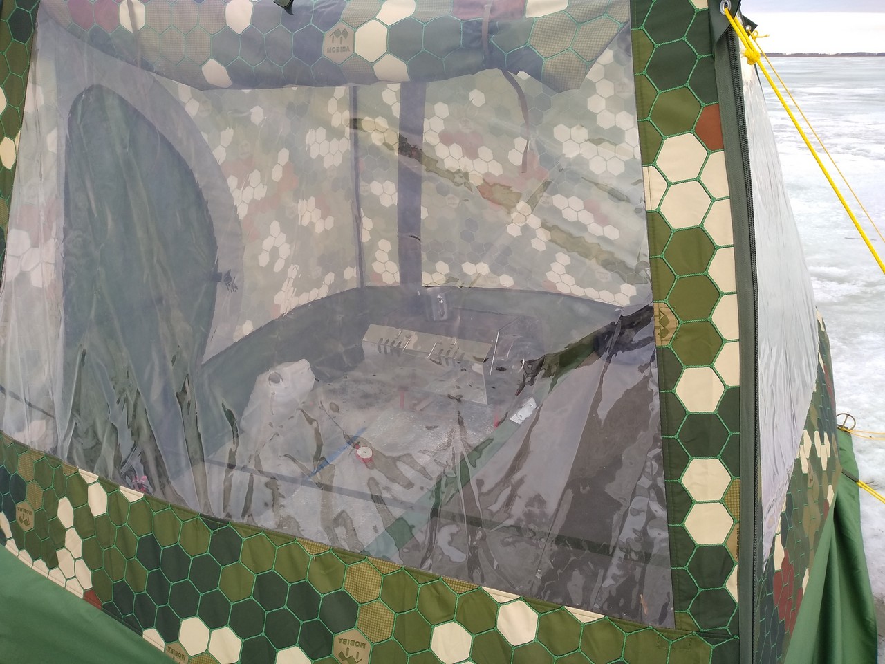 - не распахивая двери, а значит не выпуская тепла, общаешься с любопытствующими и им видно (если ты захотел этого ! ) как ты там расположился и как рыбачишь ))))