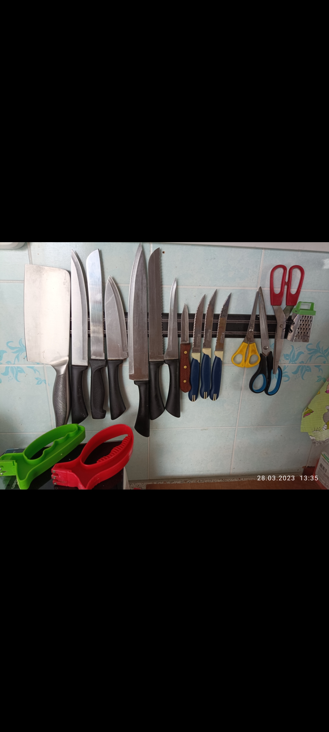 P.S. Это мой дачный арсенал ножей. Никаких дорогих брендов. С чёрными ручками, самые недорогие ножи из Ашана. Да и тесак оттуда. :D Мне больше всего нравятся ножи с синими ручками и крупным зубом. Я их купил сразу блистер, 12 штук. С мелким зубом пробовал, не понравился нож. У жены вообще фаворит, маленький нож с деревянной ручкой, не знаю что им можно делать. :D