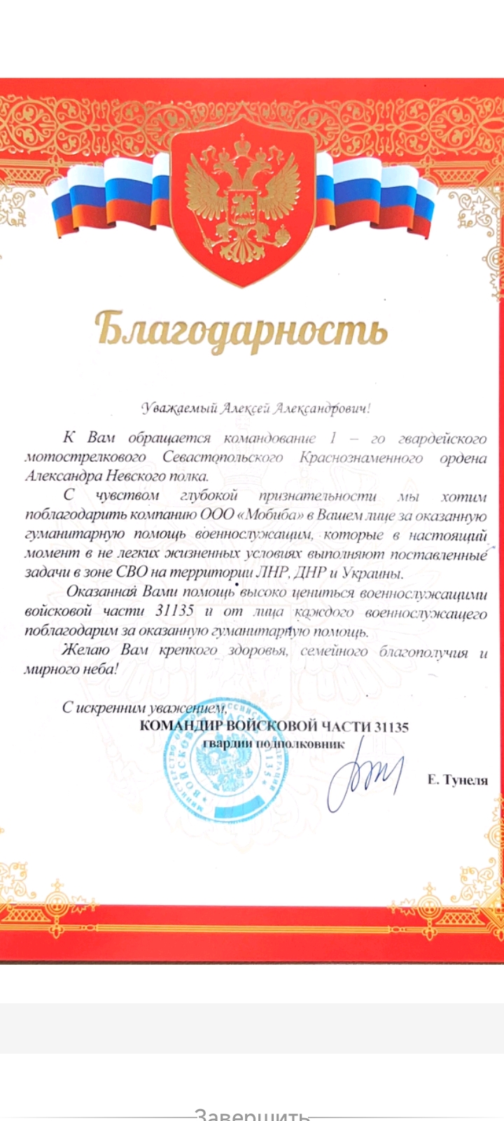 Благодарственное письмо от командования воинской части, где проходит службу по контракту мой друг Евгений, и куда был доставлен комплект РОСНАР-РС33: