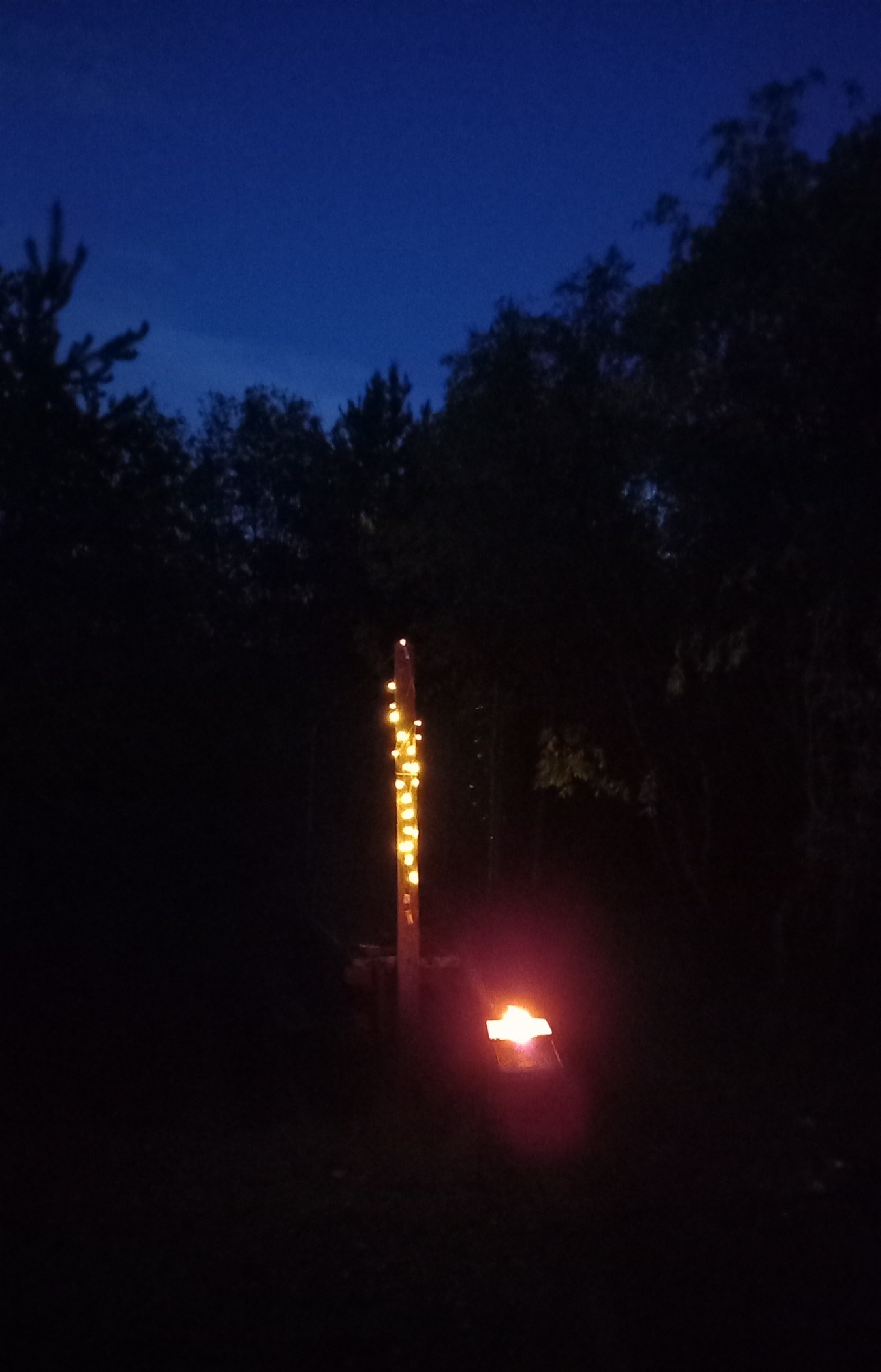 Палатка сложенная в сумку с пристёгнутым полом,это кайф,ты только достал из сумки,зацепил крючки на дуги ,достал печь,быстро установил и затопил,пачку брикетов всегда беру с собой,развесил внутри мокрые вещи,коврики,пол тёплый,супруга тоже оттаивает/греется в палатке после грозы,которой по прогнозу не было,сам ставлю шикардос и разжигаю угли,дождь уже закончился,готовлю ужин и отдыхать. Гирлянда на батарейках,тёплый мягкий свет,теперь лежит в сумке с палаткой всегда.