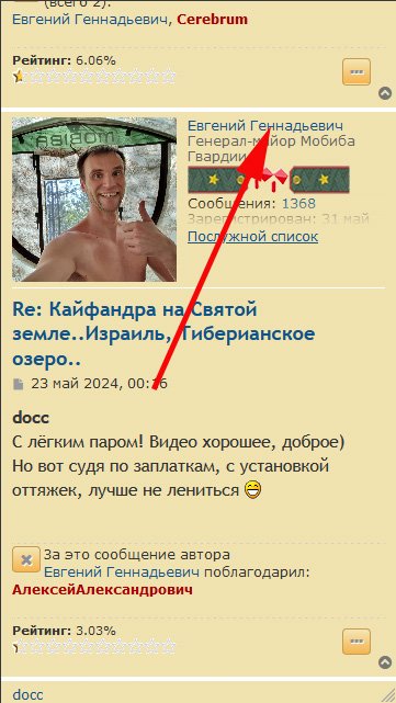 Кликаем по имени нужного пользователя форума. Для смартфонов оно будет справа от аватарки. Для обычных компьютеров под аватаркой.
