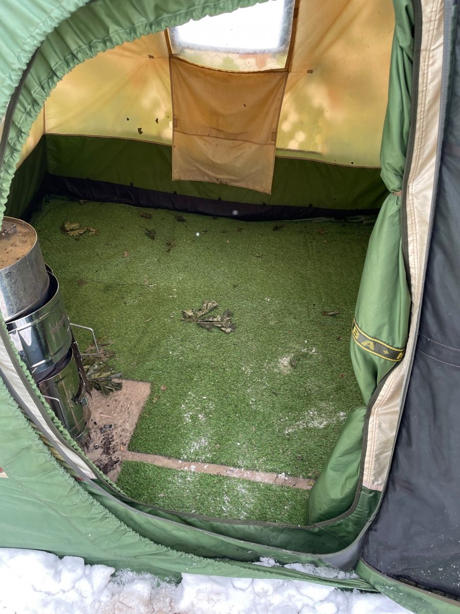Важный момент-нужно делать по размеру не впритык к внешнему слою (или внутреннему) а чуть меньше, что бы щель была между слоями и полом. То что было спрятано под нижнюю часть палатки-примерзло (не прогревалось теплом)-пришлось кое-где с силой отдирать и пару ниток газона вырвалось.