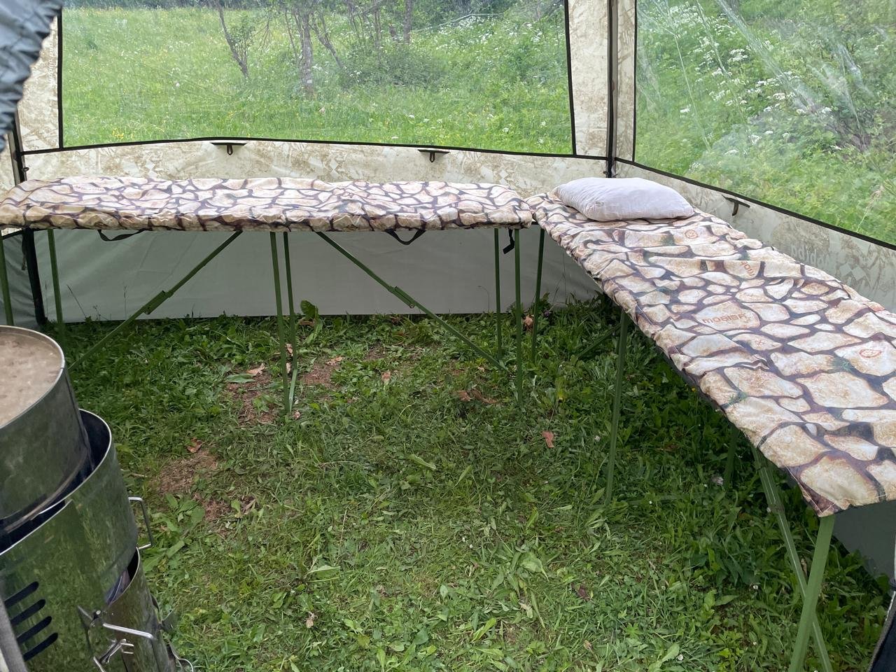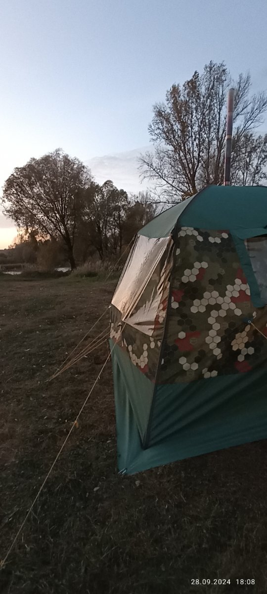 Вчера в баню выезд был,ветер 7 метров,с порывами до 12,температура на улице +19, аномально тепло для конца сентября. Но не отменять же,веники уже были запарены. Когда ставил палатку вспомнил пост про куб,что не могли установить,складывало. С наветренной стороны зафиксировал сразу юбку по двум углам, потом только дуги стал застёгивать на молнии,пришлось на все растяжки ставить,угловые тоже. При таком ветре,по три брикета,перед попариться веником, приходилось подкидывать,обычно полтора два. Печь КЦ-4. Банный кайф получили.