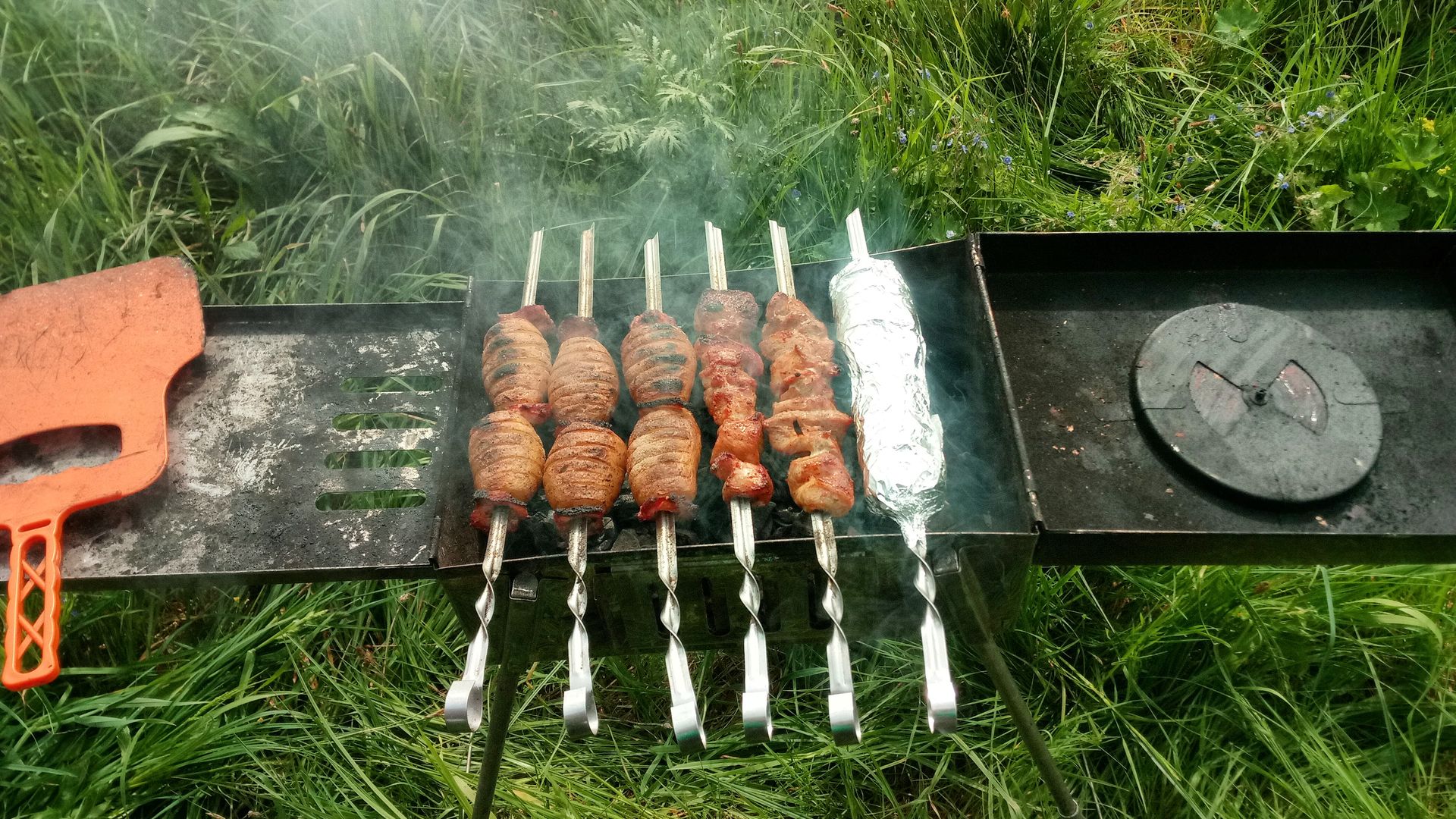 А еще попробовал жарить шашлык из маринованной грудинки с шампиньонами.