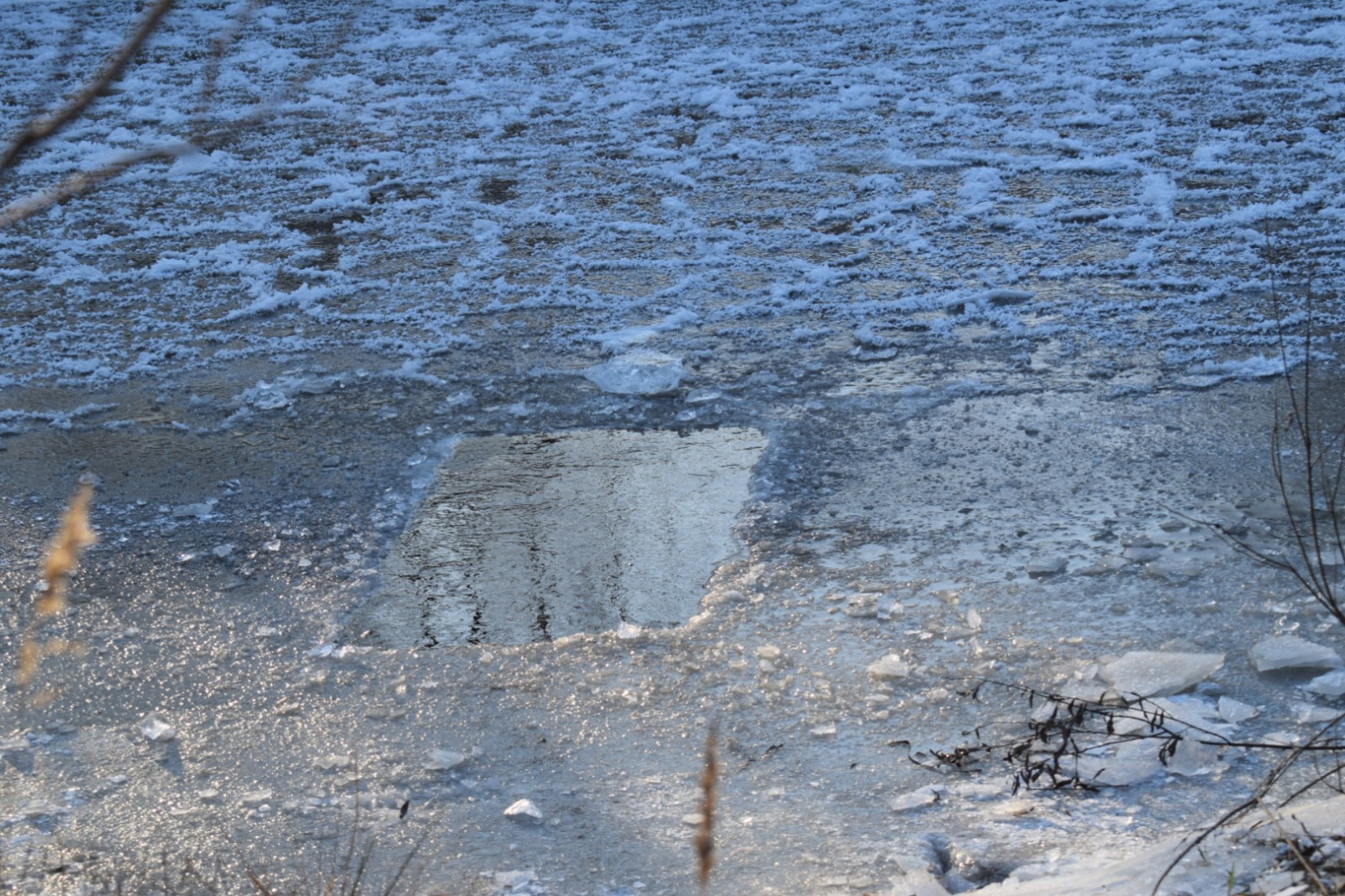 Приезжаем и видим что река вся покрыта льдом и на ней обалденные узоры, воздух парит, тишина, снега нет, травка блестит.... Обалденно. И тут и случилось то самое "Клёво". У меня "затряслись ручонки" от умиления и понимания того, что сегодня будет ПРОРУБЬ! ПЕРВАЯ ПРОРУБЬ ЭТОГО СЕЗОНА!И на форуме, кстати, если мне не изменяет память, ни кто ещё не выкладывал отчёт с прорубью в этом сезоне. Не суть. И без того моё клёвое настроение улучшилось до уровня седьмого неба.