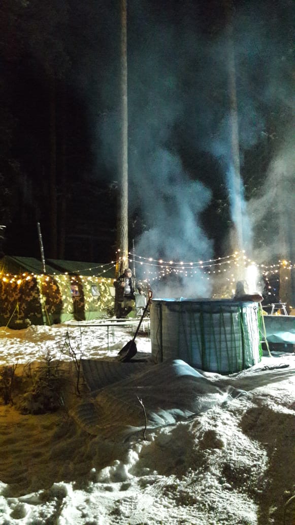 Решили мы своим близким попытаться сделать сказку на новый год(надоел нам медвепут) . Готовится начали с июня. Заказали и дрова(тонна пилетов) и развлечения (снегоходы гирлянды салюты ...)и двадцать девятого декабря рванули строить лагерь . За два дня всё наладили . В р63 был жилой модуль с двумя мега сограми. В 104 была баня на всю длину ,её прогревала медиана5 парафон 3 и паробомба (дома оставили вторую паробомбу так как многие любят поспать с парафоном на полках при медленной прожарки:) . Кухня была обустроена в 442 с мега согрой. Туалет в парнике(самоделка из полипропиленовых труб и плёнки) с согрой (пришол к тому что хочу мб22 под туалет ) и тут снимаю шляпу перед проектировщиками ! Не так легко оказывается сладить полатку под туалет:)))) ни кто не примёрз к био туалету и сам он не замёрз согра обогревала на 5 с плюсом! Была купель собственной сварки(она разборная) чашка пвх(два куба с озера прогрели часа за 4 до 40 гр . Печь самоделка из медной трубы. В р63 были переделаны раскладушки гринэл в двухярусные . Поэтому жили в два этажа. (На вопрос в выше постах отвечу точно не нужно опускать палатку. ) Кровати ооочень всем понравились . Пришол к выводу что стакими кроватями в 104 можно жить в 4 в месте с вещами и останется место под кухню в ней же. Палатка очень удобная, тёплая, светлая ,двери просто огонь(в зимних вещах очень тяжело ходить в маленькие двери ,а тут хоть на Санках залетай. Полы очень крутая вещь комфортно ходить босиком. Не боишься проживать момент когда дети сели народ так как понемаешь что они промёрзнут не раньше чем через часа два (если не двигаться вовсе) в общем и целом люди прожившие 12 дней в р63 (которые впервые спали зимой в палатке) а это 8 человек основного состава не смогли найти ни одного минуса в током жилье и проживание и всё спросили а поедим ли мы есчё и возьму ли я их с собой:)))