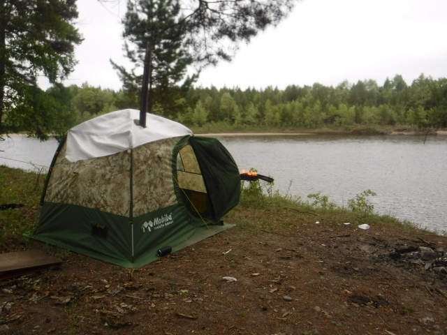 Знали, что в ночь будет дождь, вернее даже ливень по прогнозу. Взял допкрышу от 104-й. Подвязать второй слой на "попки" гораздо проще, чем на молнии у десятки. С установкой Согры пришлось немного поколдовать. Пробовали даже установить у левой стены от входа, но тогда подбрасывать в печь неудобно и большой ПСН-700 не встаёт. В итоге установили у фронтальной стены, но при этом сдвинув печь макимально возможно влево. Приличный наклон дымохода имеет место быть, но всё работает нормально. Из-за низкого потолка и меньшего объёма парилки Согра с жадеитом выдаёт в РБ-200 примерно столько, сколько Медиана в парилке МБ-104. Получается ещё один хороший универсальный комплект. При +6..+8 на улице, жару в парилке хватило нам с избытком. Думаю, зимой при утеплении пола тоже потянет. Напарились, накупались, затем вынесли полок. Умудрились установить в палатке с печкой столик и два пластиковых кресла. Только начали варить суп на Согре - пошёл дождик. К 23 часам он превратился в ливень, в полночь казалось, что на палатку кто-то льёт из огромного душа. Улеглись в час ночи и спали до 8 утра. В палатке было тепло и сухо. Тлеющего режима Согры при 3-4 градуса тепла на улице хватило с избытком. Дождь так и не прекратился, поэтому в 10 утра пришлось собирать наш скромный лагерёк. Теперь по расположению раскладушек и ночёвке. Две больших, типа "Медведя" точно с печью не войдут. Обычные кемпинговые с трудом. Дело в том, что ветровые оттяжки на стенах, в отличие от той же десятки расположены высоко и на уровне колена (высоты раскладушек) палатка практически не растягивается. Вариант - ПСН-700+раскладушка, как мы иногда практиковали в десятке, тоже не подходит из-за более покатых стенок палатки. А вот две подростковых 185х55 встали легко. Кусочек видео (фотик сел в самый неподходящий момент)