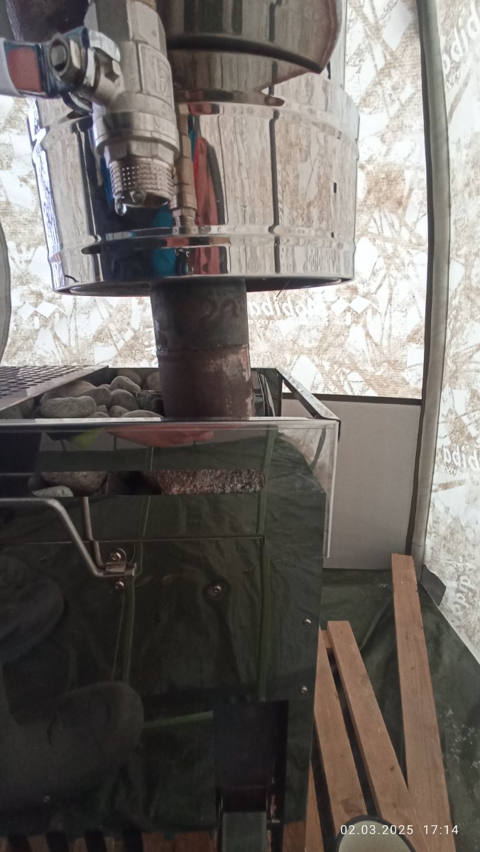 Правда конкретного сравнения с П-4 не получится. П-4 был новенький а П-3 отработал два сезона. Но по внешнему виду перегреватель не сильно заражён. Да, присутствует небольшая накипь, но возиться с лимонкой нет времени. Погода тоже сменилась в сторону низкого давления. Но пробовать же надо! С прошлого эксперимента перегородка отстегнута, значит и начнём с этогой же конфигурации. Грузим Медиану брикетами, заливаем парофон, поджигаем). Да, ещё добавил пушку Магола. Парофон третий встал на М-8 как родной). Михаил, на счёт удлиненного патрубка. Если разница по пару небольшая, я бы оставил заводской вариант установки парафона. При этом он опирается на корзину для камней, тем самым разгружая варочную поверхность печи. Я завтра сделаю фото своей Дюны, которая работала с П-3. Унылое зрелище). Ну, или как вариант, сделать приблуду между Парафоном и корзиной. Теперь по кодициям. Как я и предполагал Вау-эфекта не получилось и до Паробомбы эта связка не дотянула. По влажности. Да, побольше чем с П-4, но не в разы. Ожидаемо. Площадь испарения в П-3 не намного больше П-4. Вообщем, по кондициям, получилось примерно как у тебя. Неплохо так для такого объёма. Но мне для веников маловато. Решил поместить и застегнуть перегородку. Перегородку то я застегнул, а при попытке вставить каркас двери произошёл хрусь. Сломалась одна трубка каркаса. Да чтож такое. Пришлось дальше принимать процедуры с открытой, так сказать, дверью. Как результат- чуть не хватило. До "шкуры питона" не добрался).