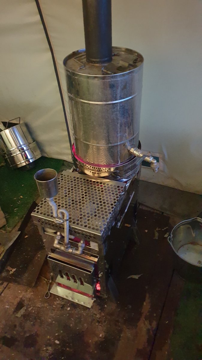 В итоге получается такой удобный, практичный, все еще малогабаритный комплектик из печи и парогенератора. С большой каменкой, визирным баком. Ну, прелесть же?! Если не надо пешком в горы идти и речь об автомобильном (на компактных автомобилях), лодочном бантуризме - я бы такой комплект предпочел другим нашим печам. Все в нем есть и это миниатюрно. Мало багажного места занимает. Легко в переноске, обслуживании. Мне такое очень нравится.