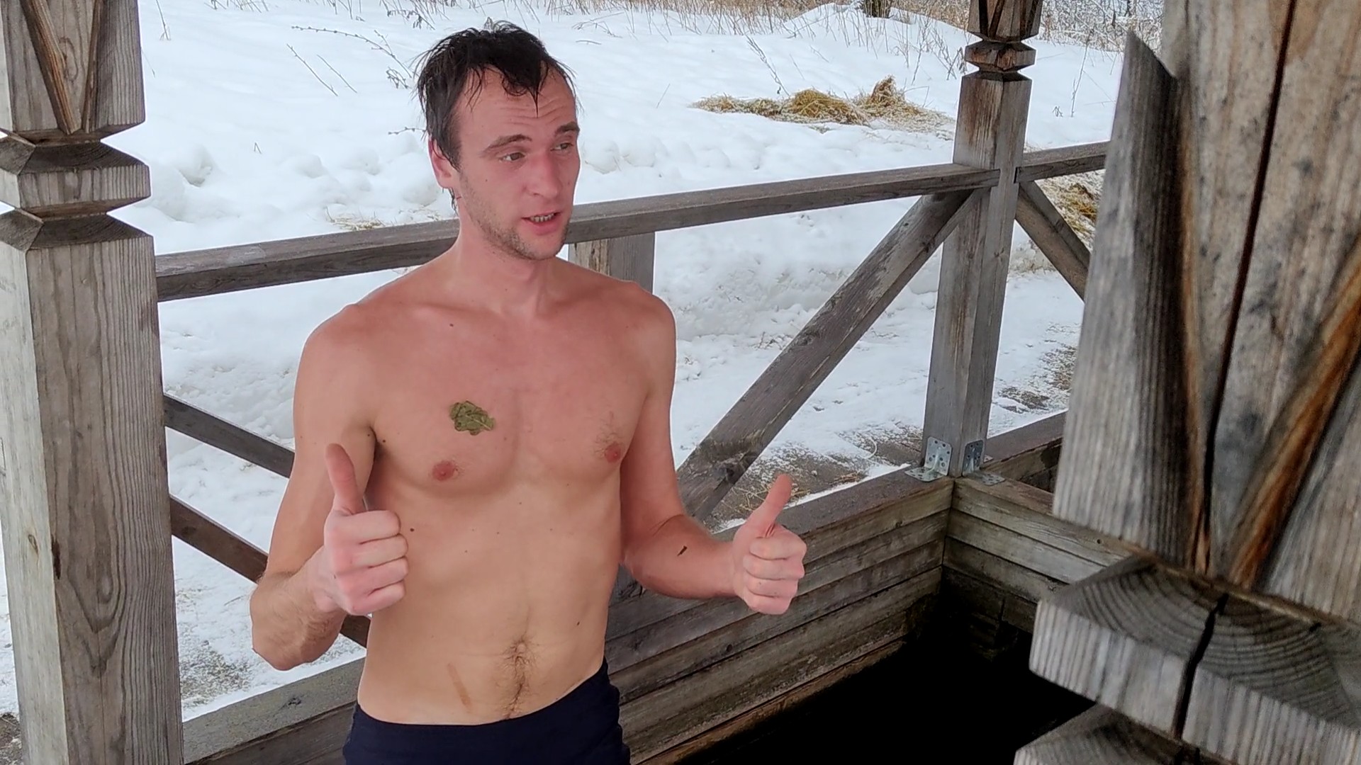 Затем, окунувшись в комнатной купельке с холодной, но не ледяной водой, пошёл на улицу и дополнительно упал в снег, полежал в нём немного и ещё пару минут прогулялся по свежем воздуху. Вскоре, почувствовав мелкую дрожь, от столь длительного охлаждения, решил снова пойти покорять "логово огнедышащего дракона"