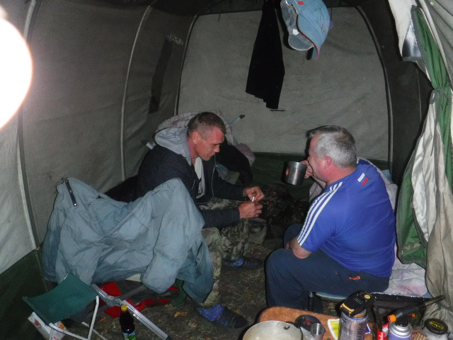 Поставили около сорока закидушек на протяжении 6 км по реке. В качестве живца - мелкий карасик и большой белый червь-ручейник. Груз - обычный камень голыш на верёвке, от груза через метр-полтора поводок с живцом. Заводили на лодке в тихих и относительно глубоких местах вечером и дважды проверяли ночью, завозя лодку вверх по реке. Привязывались в основном к кустам на берегу, либо за крупный камень. Взяли две щуки на 3 и 4 кг, с десяток небольших ленков. Начал шевелиться налим, охота в общем-то планировалась на него, но попался с пяток, тоже небольшеньких.