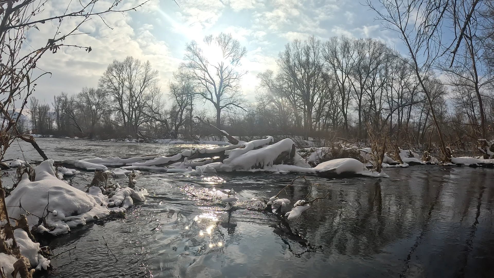 На речке 0 градусов, солнечно. Недавно выпал свежий, весенний, мартовский снежок.