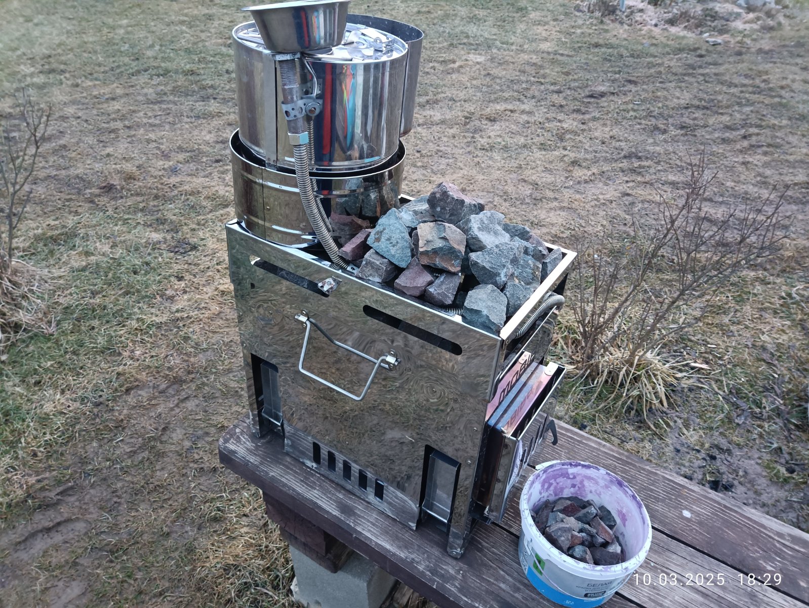 Тут в наследство достался вот такой перфоратор, расколол большие камни. Предварительная примерка, вошло 20 кг камней, понятно что укладывать буду более плотно и не сегодня ставить печь в баню, но просто не удержался.