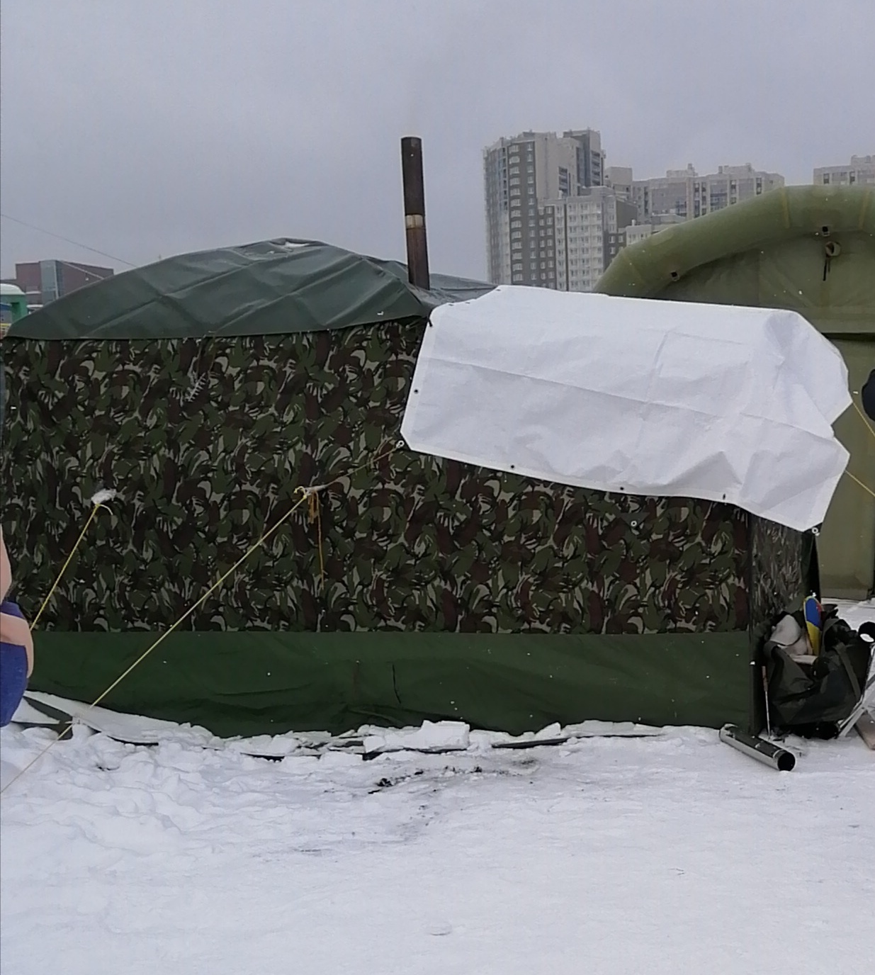 Нинель, а что за изделие на втором плане? Подстраховка, чтоб молнии отогреть или если штатный тамбур 15-ки не зайдёт?)Нинель писал(а):Вернусь к тенту. Вчера, наконец, опробовал тент на Мб-15. С ним баня работала гораздо лучше. Летом молнии застегиваются и растегиваются без проблем, Но зимой при морозе на них образуется лёд и молнию с замком сломать не проблема. При маловетренной погоде, хотелось бы пользоваться крючками. Я специально взяла тент с укороченный тамбуром, чему очень рада. Его легче ставить, собирать и сушить, внутри тента образуется конденсат, без печи. ., но этот метр, очень приятная опция. Жаль в него не влезает красная сумка(+20см). И дверь на тенте не удобно пришита.