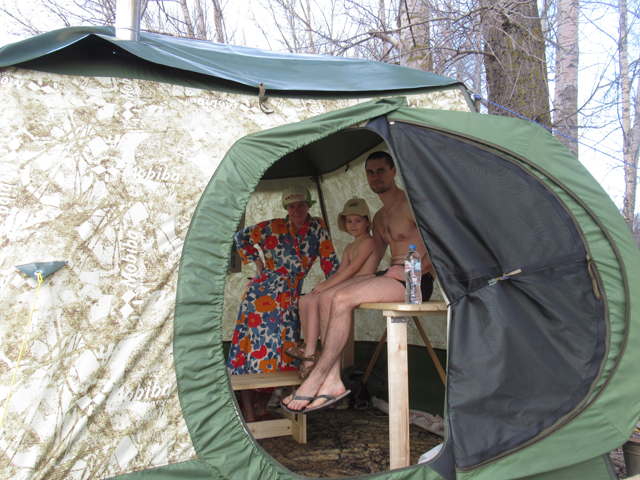 Банный зимний день начинается рано, чтобы захватить светлое время. От момента приезда до того, как мы ложимся на полки уходит час с четвертью и точка. Первый раз греимся без фанатизма и перерыв. Второй раз закладываю полную топку и ложимся «лапки к верху». Минут через пять начинаю поливать на каменку заварку трав для аромотерапии и ингаляции. Через 10 минут температура на уровне полков уже около 60ºС – это для жены достаточно. На голову кладу эвкалиптовый и берёзовый веники, чтобы легче дышалось. Начинаю с бамбукового веника, потом в ход идут березовые и дубовые 10 – 15 минут. Технику парения познаю из нета, конечно после «Форума». Информации много, глотаю всё, в голове правда пока каша. Итого: 20 – 25 минут, обмываемся, задвигаю зольник, расстёгиваю молнию на двери, в результате чего температура падает до 25 – 30ºС и перерыв на пол часа. Пъём заварки из термосов, воду из родника, несколько раз понравился квас, но зимой проблема найти хороший – раза три точно просто вылил. Третий заход мой. После повышения температуры 60ºС жена спускается на скамейку, а ноги на полке. Температура ещё поднимается до 70ºС и у меня начинается практика техники самопарения, при этом часто поддаю на каменку из таза, где замачиваются веники. Заметил то, что когда закипает вода в баке дышать становится хуже, но тогда просто подливаю холодной воды. Опять минут 20-25, Татьяна внизу успевает наскрабиться. Обмываемся и я в реку. В снегу поваляться этой зимой не удалось. Один раз что-то было: лёг на снег, а он подомной расстаял, встал весь в листьях. И опять перерыв минут на 30 – 40. Опять напитки из термосов, по желанию фрукты: бананы, киви, помело, мандарины, но больше нравится хурма. Четвёртый раз Татьянин, потом она одевается и гуляет, а пятый мой. Вот так день и проводим. Час на сборы и домой. Максимальную температуру видел 72-73ºС, но это на одной закладке без подкидывания в процессе парения - сначала мыслями хочется побольше, но после 20-25 минут тело говорит достаточно. При комплекте МБ-15, Медиана-5, тёплый пол за эту зиму попали на минимальную температуру воздуха -10ºС по приезду и -10ºС по отъезду, согласен днём было меньше, в Мобибе комфортных 70ºС. Нижний порог мороза мне пока не известен.
