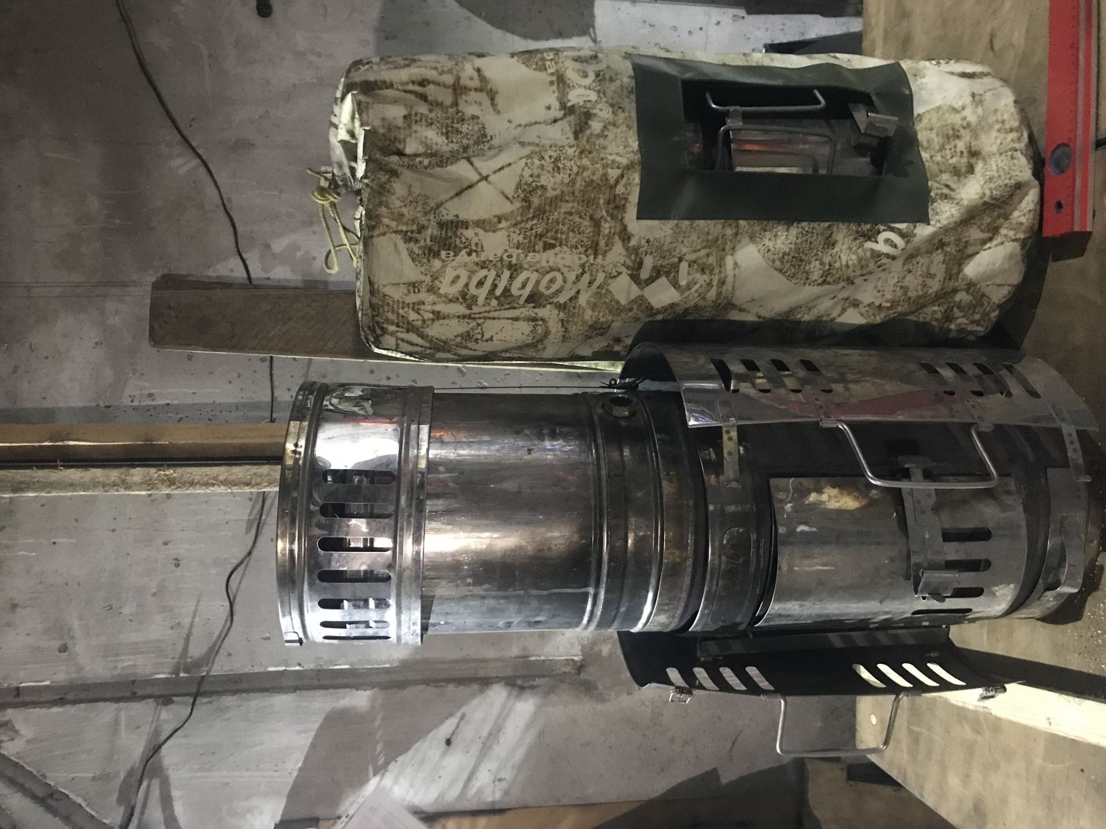 и одного цилиндрического сегмента d75 на 33 см, служащего оголовником дымохода, и в транспортном положении прячущегося в один из сегментов d90, как в норку, или даже как некий маленький стерженек, проваливающийся в огромную шахту, которая пренебрегала упражнениями Кегеля