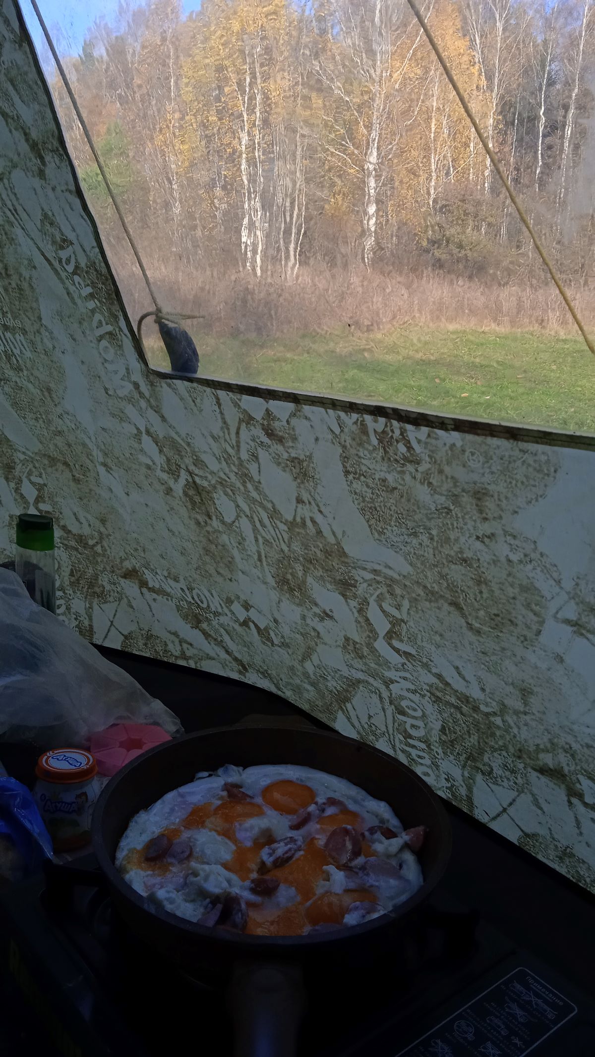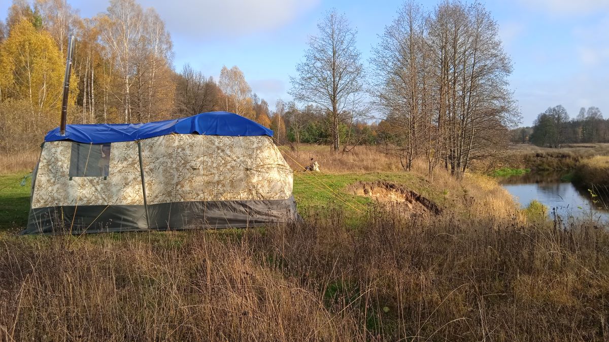 Забросились вечером 2 ноября, буквально за 15 минут перетащили на стоянку за 150 метров все наше барахло от канавы, которую газель не могла преодолеть геометрически). Поставили лагерь, поужинали и спать. Мегасогры хватило на 8 часов, ночью раз проснулся как будто от хлопка какого, и сверяя утром ощущения, вроде как пахло дымком несильно и недолго. Вероятно снова конденсат капнул с трубы в печь. Оставшиеся ночи открывал заслонку посильнее, и мне на полке 700 мм спальник был не нужен