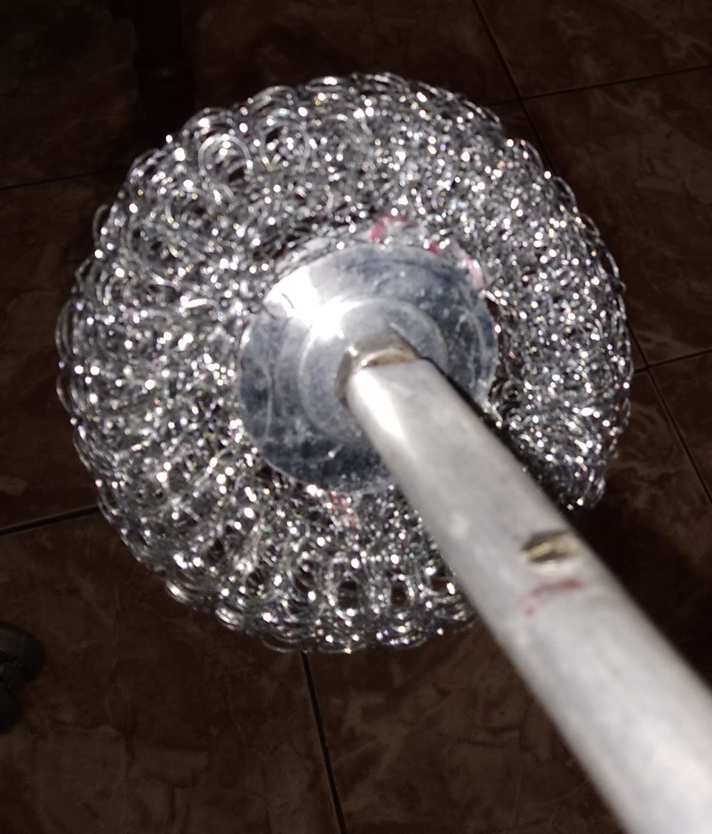 испробовал свою конструкцию, палка все же коротковата приходить с разных сторон чистить, диаметр 100 многовато для стальной щетки, пришлось проредить болгаркой.