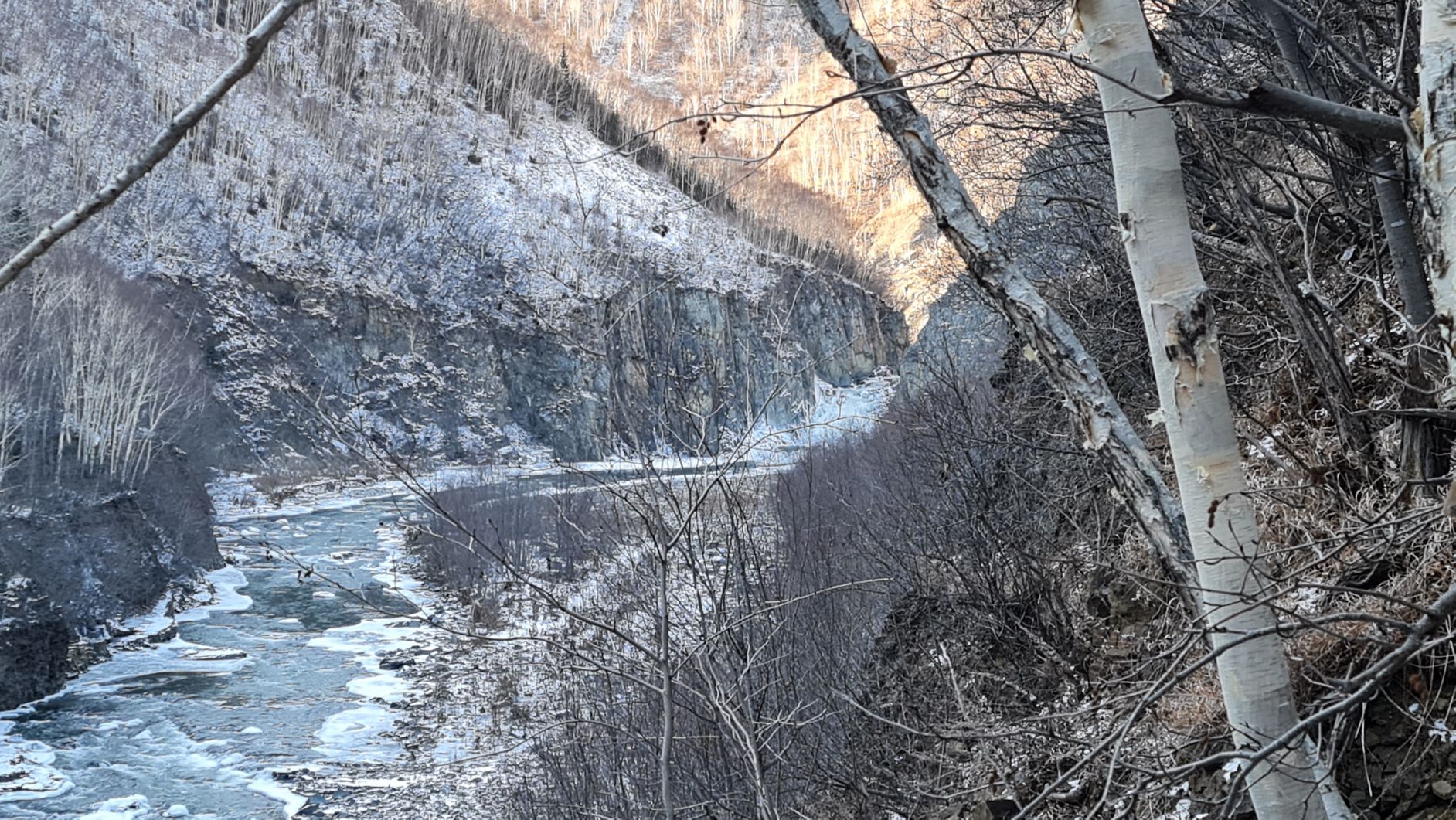 Вышли из лагеря около 10:30 утра, хотя в идеале нужно было выйти на пару часов пораньше. Чуть дольше собирались дома и местами гололёд на дороге не позволили приехать раньше. Первая половина пути была боле менее спокойная, хотя постоянные небольшие подъёмы и спуски не давали расслабиться. Шли в основном по охотничьим тропам, хоть я заранее и загрузил треки и обновил все карты, но треки оказались не совсем точные, а благо лежал небольшой снежок и был виден след охотника обходившего свои владения. Если бы шли полностью по треку, то времени ушло бы намного больше, все таки дорога постоянно петляла и порой не соответствовала треку. Со второй половины началось самое интересное, сначала затяжной спуск состоявший из четырёх частей, а затем свалились в ручей и около полутора километров шли вдоль этого ручья постоянно его перешагивая, перепрыгивая , продираясь сквозь кусты и прочее. Спускаясь вниз из головы не выходила мысль, как же мы будем подыматься по нему, но это все лирика.