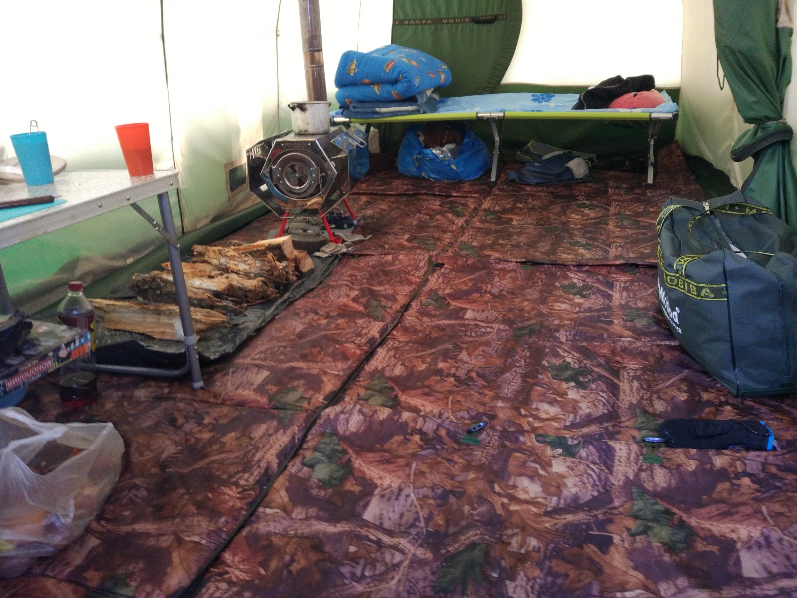 На Крещение выбрались с семьёй на природу на несколько дней и ночей. Выходные очень удачно совпали. Всё было супер. Жене и детям очень понравилось, а мне тем более. Попробовали Согру зимой, надо сказать с ней лучше ночлег, чем с Медианой))) Топили местными дровами: жар давали хороший и горели быстро. Приоткрываешь заслонку и печь быстро становится красной, а внутри палатки жарко. К данному выезду заказал две раскладушки Norfin, но в магазине в самый последний момент выяснилось, что осталась одна. Деваться не куда - берём. На ней спали наши дети. Вернее сказать начинали спать, а ночью сползали на пол - жарко на ней оказывалось. Дело в том, что мы учимся топить Согру и мы с женой спали на полу, постелив одеяло на ПУ. Когда на полу тепло - на раскладушке реально жарко, так и жили, а вот вторую ночь было по-легче так как более менее приспособились.