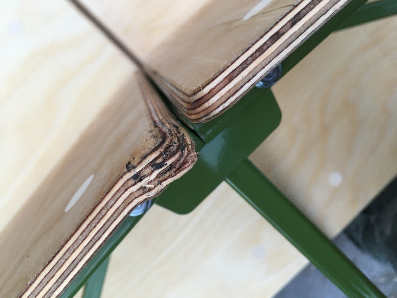 Я бы, как советовал Евгений Геннадиевич, спилил бы замятый угол. Фанеру полка пропитал бы маслом для банных полков. У меня так и сделано. Заглушку шпаклевкой по дереву можно восстановить. У меня они все повылетали почти. Я не заморачиваюсь. Стелю на полок всегда туристический коврик пенку. Комфорт возрастает в разы, а на полок влага практически не попадает. Есть коврики-матрасы. Снизу оксфорд, сверху текстиль, внутри наполнитель искусственный. Очень удобные коврики. Сохнут замечательно. Очень советую.