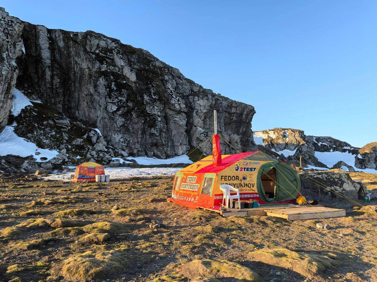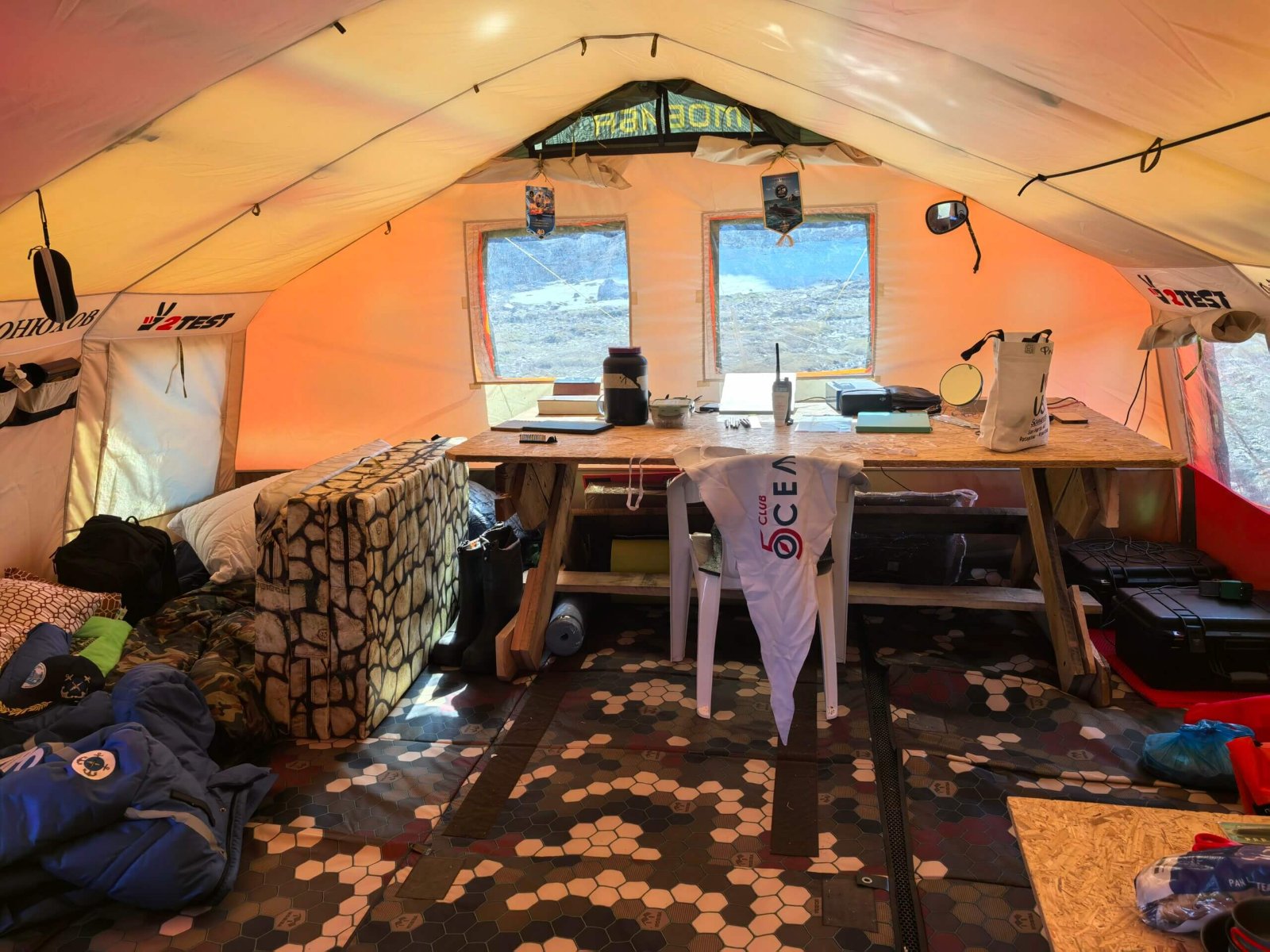 На земле невозможно установить палаточный лагерь: ледники тают, и ручейки воды стремятся по склону в океан. Спасение — только в деревянных подиумах и платформах. Пока одна часть команды с плотницким опытом собирала подиумы, другая ставила палатки. Всего четыре рукотворные конструкции на станции: основная палатка для сна, рабочая палатка (она же радиорубка, творческая мастерская и кают-компания), палатка-склад и разборная часовня с куполом.
