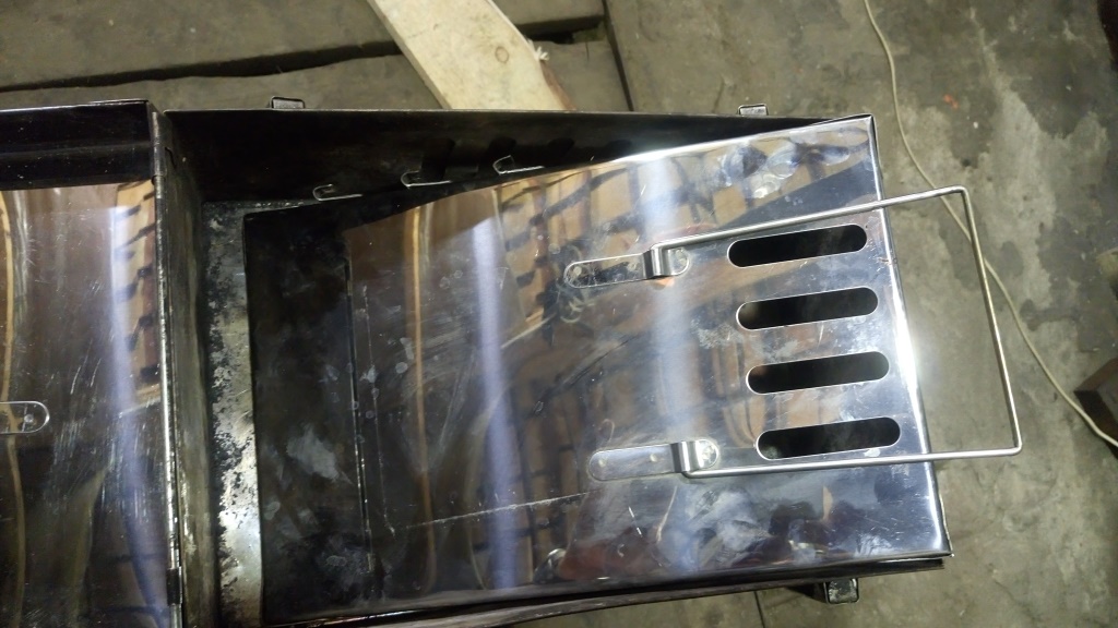 Далее, думаю, будет понятно и так.... Крючки крепил на вытяжные заклепки. Крючки могут поворачиваться Вот так полка с крючками укладывается в мангал А вот так выглядит результат... Теперь полка свободна для своего прямого назначения!