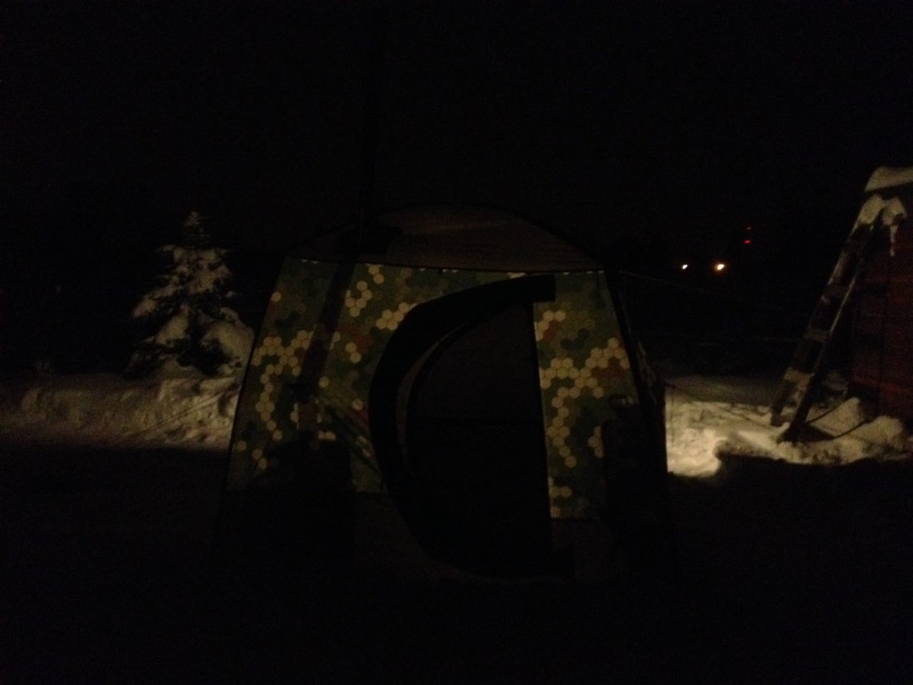 Начнем с того, что покупка была согласована с женой и остальные члены семьи о ней не знали. И вот наступил день субботы, который я очень почитаю и всеми возможными и невозможным способами освобождаю его каждый раз от любого вида работы ради бани. Первым делом на свет была извлечена печь. По совету производителя я на открытом воздухе произвел обжиг в течении полутора часов. Рекомендую не пренебрегать данной процедурой, потому что во время этой топки действительно слышался запах горящего масла. Разумеется, услышав звук работающего пароперегревателя, я не смог удержаться от того, чтобы поставить под струю пара веточку, которая за 15 секунд успела задымить, обуглиться и начала тлеть. После прогулки с собакой вернулся отец, увидел как я топлю улицу и задал вопрос о происходящем. Я дал сопутствующие пояснения. После чего к нам присоединился брат и начался процесс монтажа. Палатку собрали очень быстро. Неспешно закрепили все ветровые растяжки, потому что решено было оставить баню для постоянного использования. Зная о прочности каркаса, проблему сохранения статуса недвижимого имущества в случае сильного ветра (как сейчас) решили путем закрепления 3 основных растяжек к дому, летнему душу и туалету. Все остальное закреплено на кольях. Юбка обсыпана снегом и,скорее всего, уже вмерзла в лед. Для использования в темное время суток с внешней стороны окна была закреплена холодная светодиодная лампа. На пол был постелен теплофол 5 мм, которого вместо 10 оплаченных метров мне завернули всего 5, на него уложены паллеты. Из садового стола был сделан большой полок 200х90х80, справа от него установлена лавка до самой двери, на которой у входа разместилась бочка для холодной воды на 60 литров, а во время парения на полке, на этой лавке комфортно размещается третий посетитель. Пара ночных фото перед началом описания впечатлений.