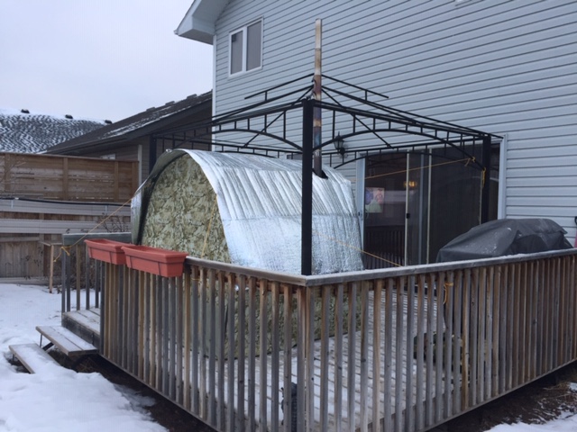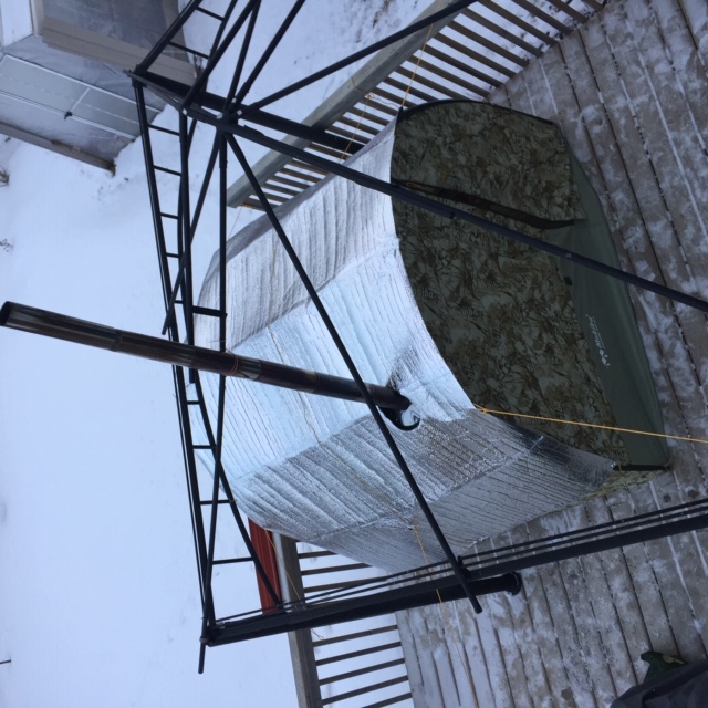 Приехал обратно в Саскатун, поставил ее на терасске у себя, приладил столик высокий вместо полка, накрываю тостым полотенцем. Прикупил камней - крупный декоративный гравий (5 см). На парогенерацию выходит через 20 мин, Камни греются до шипелки примерно час, до гейзера ~1:30.