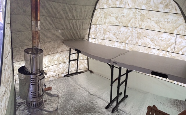 Первая ходка при -18 снаружи - с каминными брикетами удалось прогреть только до 65С - огорчилсся слехка. Прикупил местной пенофолки, кинул на пол, на крышу - уже лучше, но все равно только до 70С. Утеплил также и торцы. Получилась полная двухслойка.
