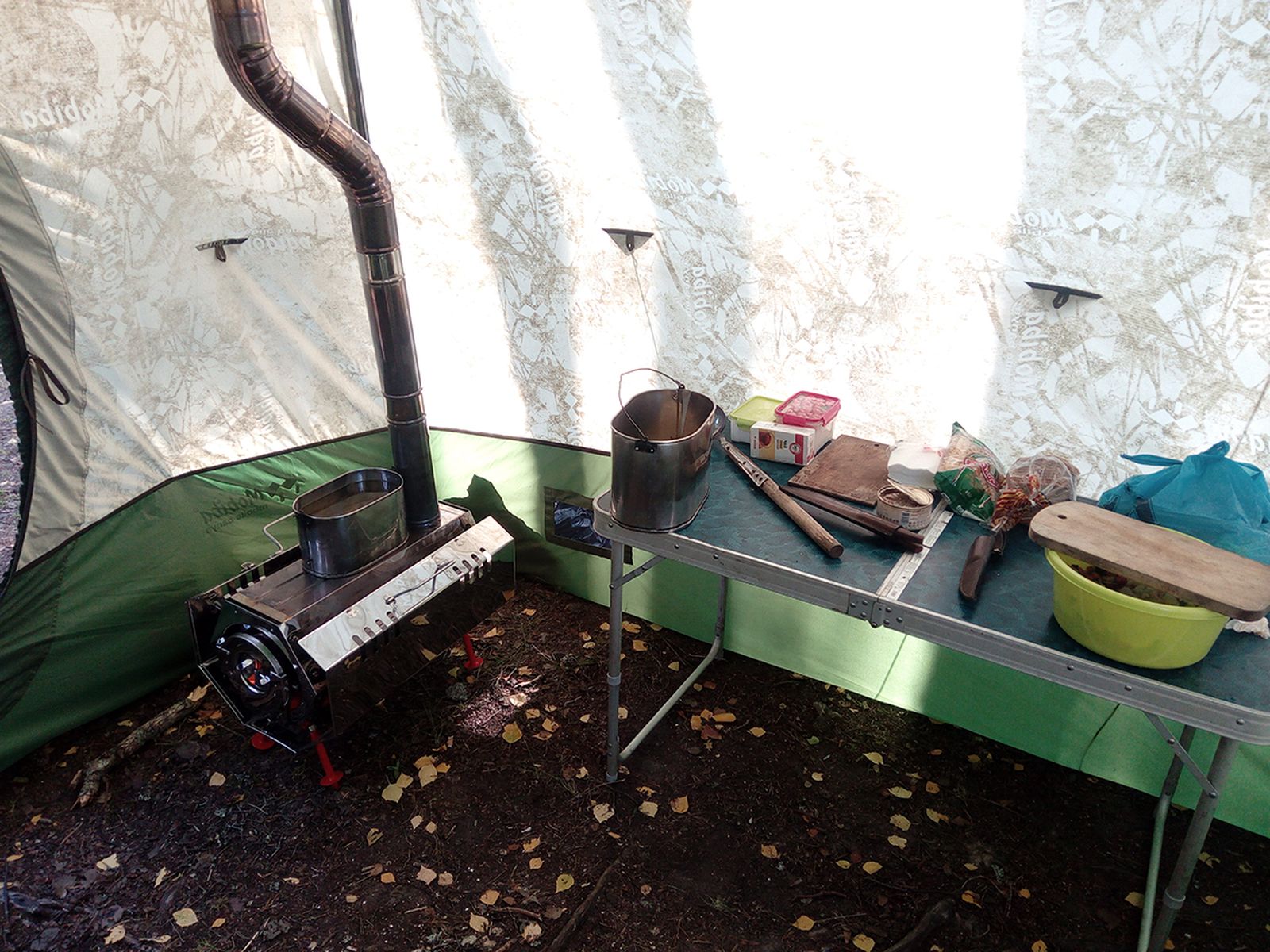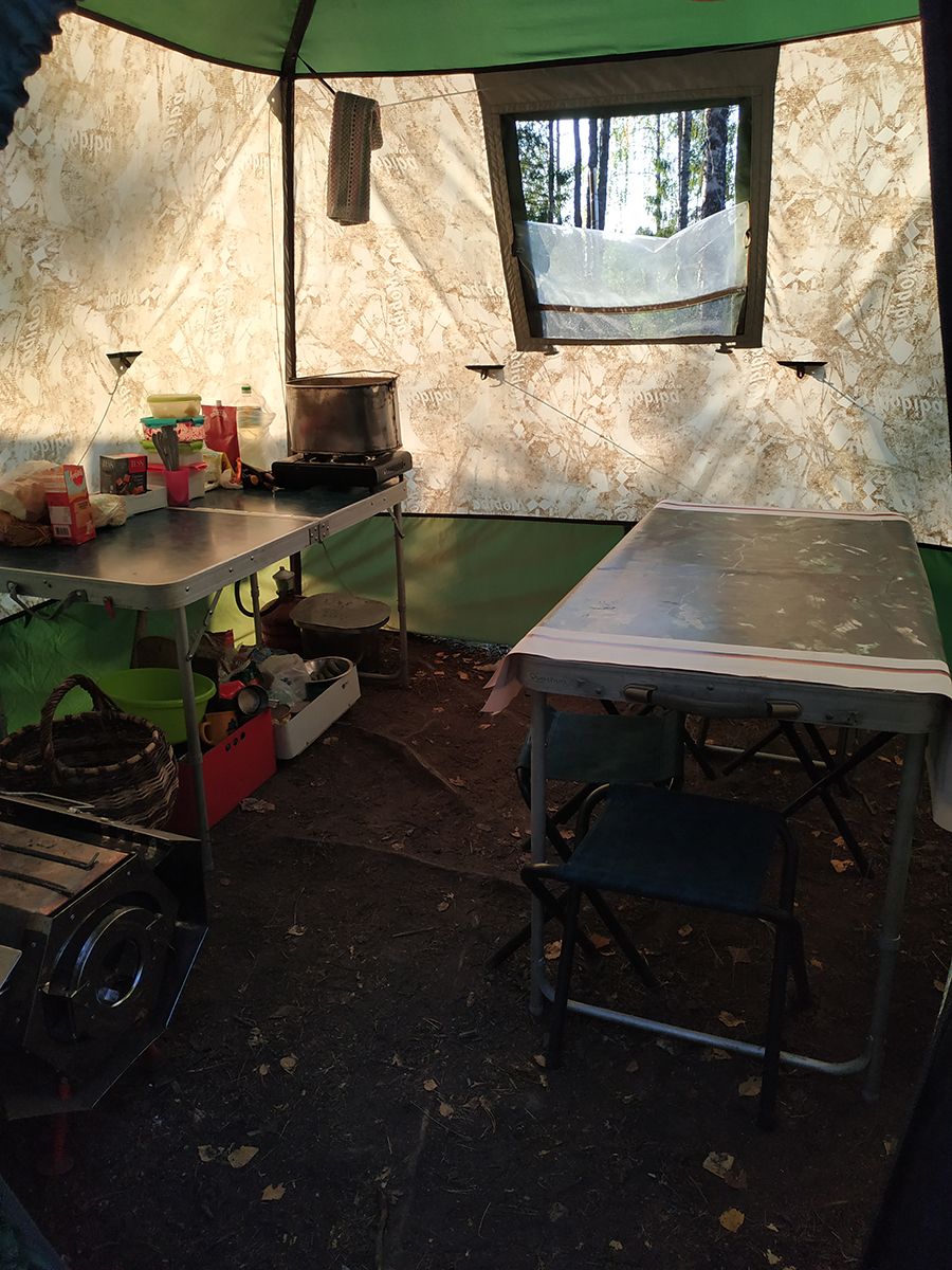 МБ-15 в связке с Согрой отлично справилась со своей ролью. Готовили как на печи, так и на газовой плитке. Каша со свеженамятой брусникой по утрам, тосты на Согре, молотый кофе, сваренный на ней же... После такого завтрака готов к любым свершениям и дальнейшему получения удовольствия. Иногда не хватало вентиляции под потолком, спасались дверью с москиткой или полностью открытой, открыванием верхнего края (или всего) окна, приподниманием юбки поленом. Да, чуть тесновато всемером, но повторюсь, мы худые, да и собирались за столом все вместе не каждый прием пищи. Через петли для клевант внутреннего тента натянули веревки, и использовали их как сушилку для вещей. На ночь набил полную топку, и все постиранное с утра было сухое.