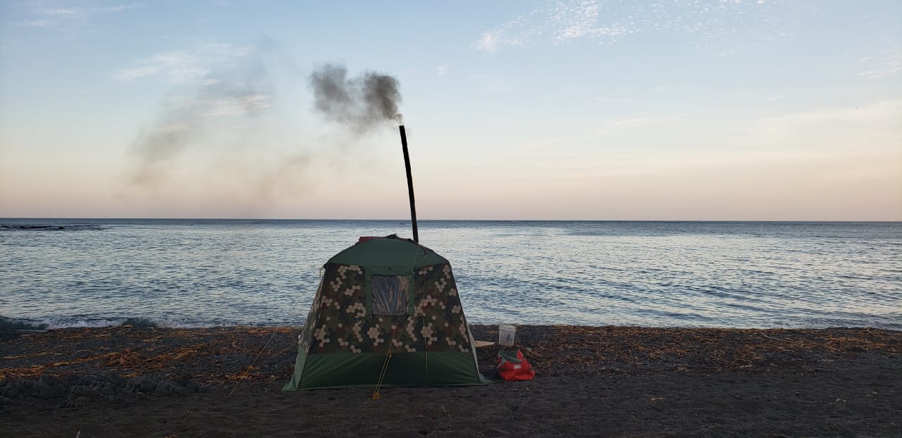 В ход пошла привезенная с дома просушенная береза, а вслед за ней пошли и «бешенные температуры» ))) Закончилась суббота торжественным купанием в Охотском море и посиделками у костра.
