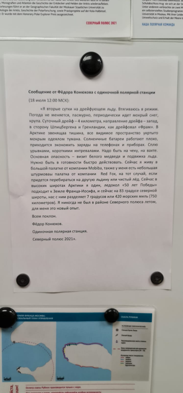 Мы с женой сейчас в Мурманске. Вчера сошли с ледокола. Конюхов еще там, на льдине Если что-то случается, то до ближайших людей 2500 км. Вертолет не долетает, а самолету сесть негде. Ледокол дойдет только за 5 суток.