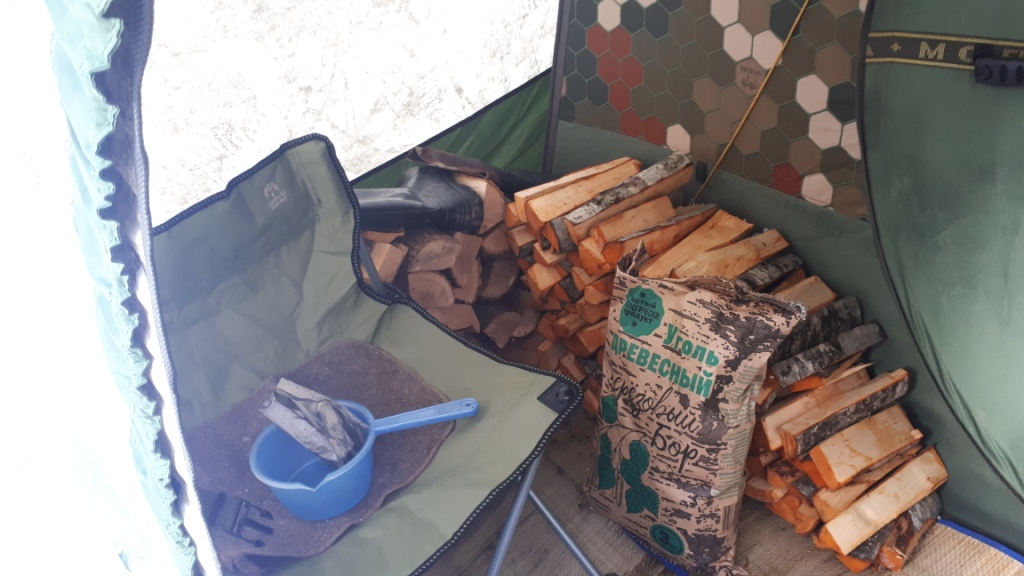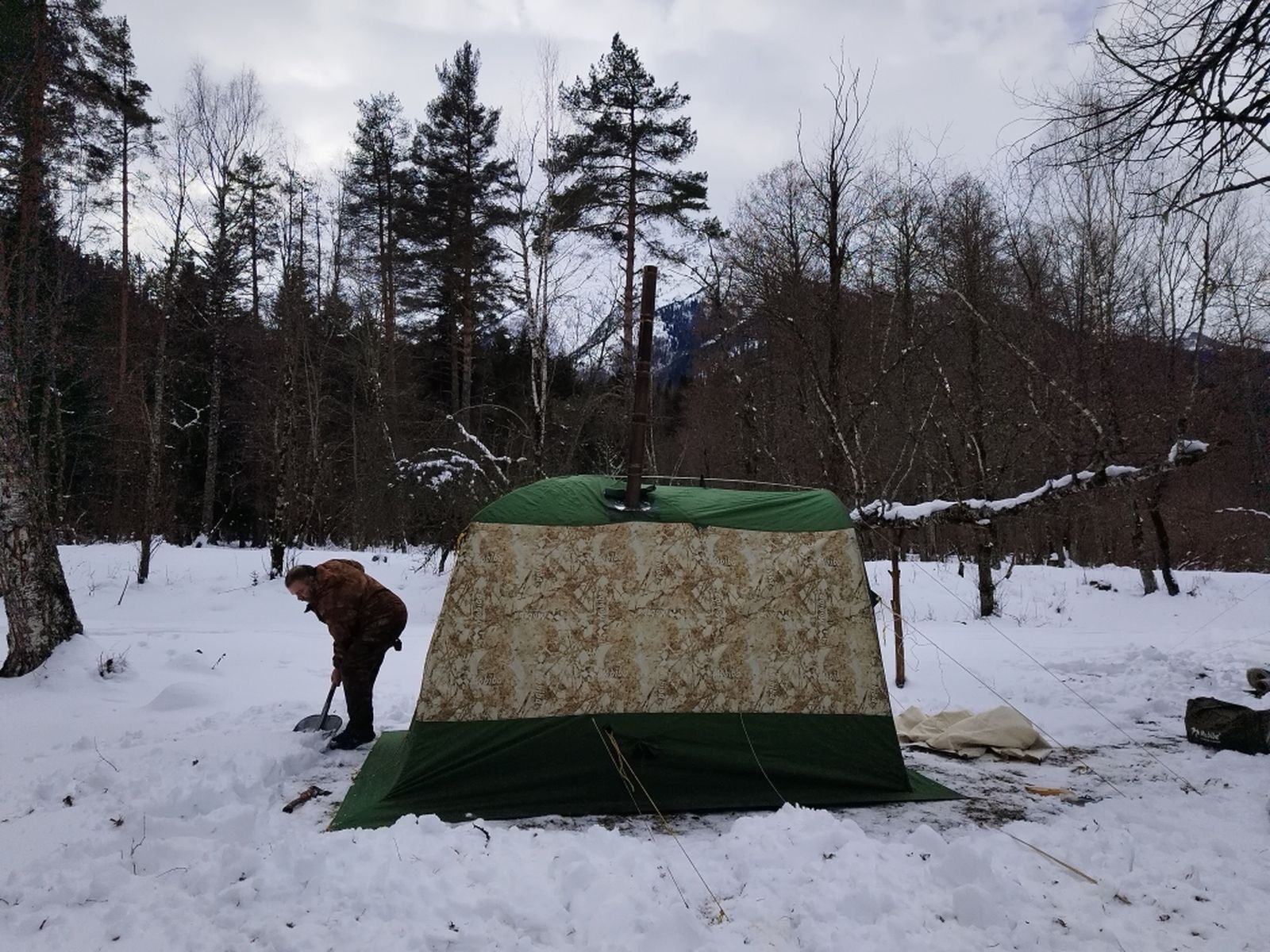 Доехали до снега, снега было не много – ниже колена, но слежавшийся уже подмороженный с настом, тяжелый. Заехали на знакомую поляну около речки и стали лагерем на 5 дней (а может на 6?). Достал лопату и давай копать снег – это самое мое нелюбимое занятие еще по работе. Очистил нужнын площади и давай ставить МБ10 + ТН10.