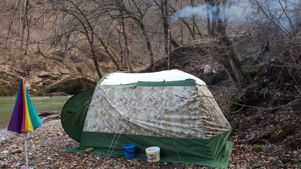 Долго ждали погоду но когда прогноз более менее выровнялся - поехали в последний день дождей. Приехав на место обнаружилась грязная и большая река. Но мы не расстроились - горные реки быстро поднимаются но и так же быстро падают. на второй день река упала и относительно почистилась. Поставили МВ10 + ТН10 + КЦ4. На мой взгляд классический набор. Без второго слоя уже по традиции не ездим не летом не зимой. И дрова экономит и предбанник классный. в общем мне больше и ничего не нужно. И сейчас идет борьба не за зару в парилке как раньше а за умеренность, т.к. чуть чуть перебереш с дровами - в парилку не зайти. Дошло до того что стал искать сырые дрова и чурки кидать рубленные только пополам. Ну и куда же без шикардоса. дошло до того что я уже дома не могу пожарить на большом стационарном мангале - все что то не так, то не прожарится то подгорит. На шикардосе все просто - мало углей, прикрыл крышку, отрегулировал приток и жарь себе не заморачивайся. Ничего не разгорается, все ровно. В общем классно. думаю может мне второй прикупить, а то для дома большой семьи одного не хватает