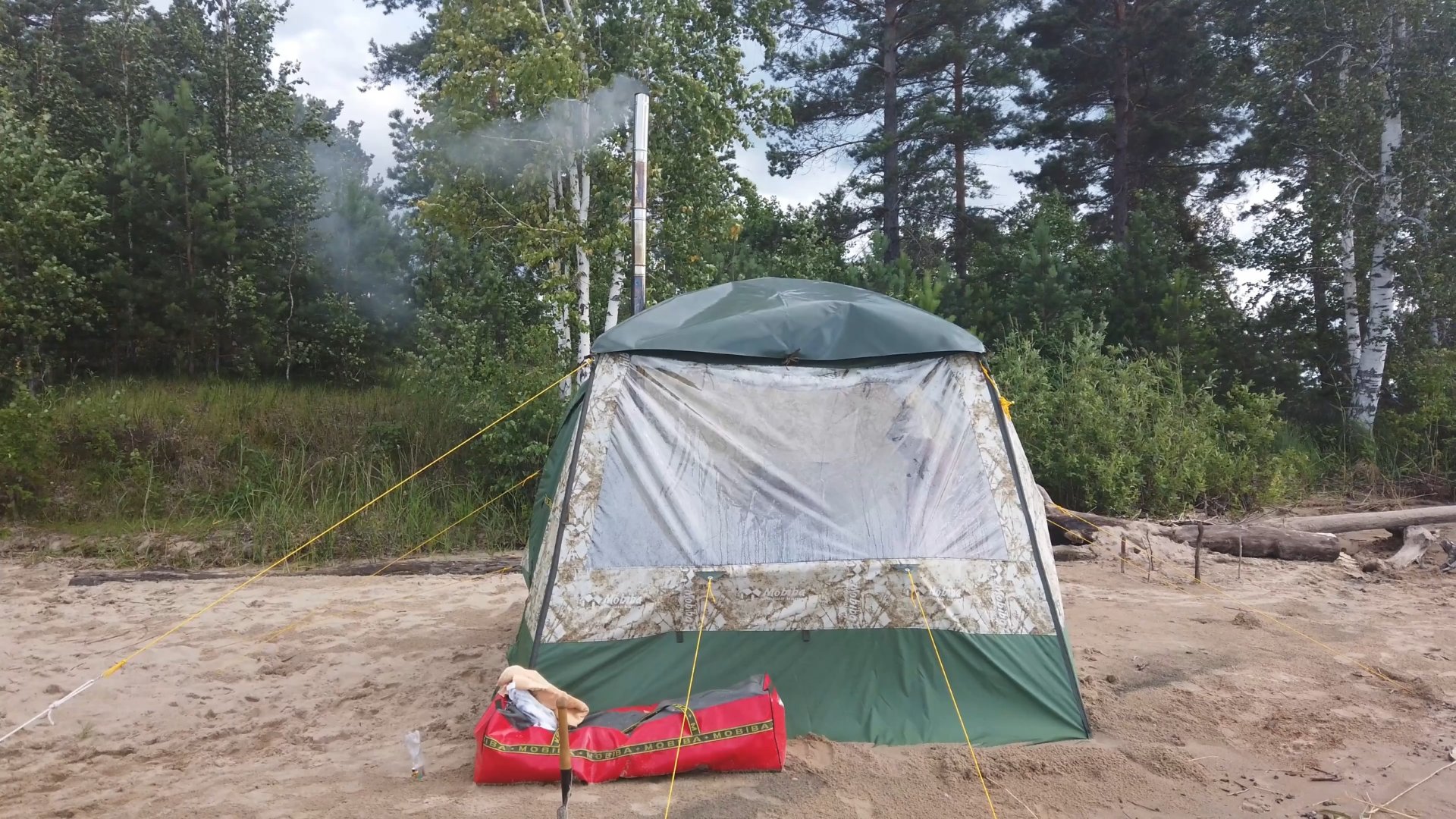 внутри постелили березовый лапник отдыхали мы на острове неделю. середина июля. и однажды вместо жары погода преподнесла сюрпризы в виде прохладной и пасмурной погоды. у кого-то настроение, может быть, и подпортилось - но только не у участников данного "похода" - банька просто зарешала! а еще к вечеру и разыгрался "лёгкий" ветерок, но Мобиба справилась (кадр из видео)