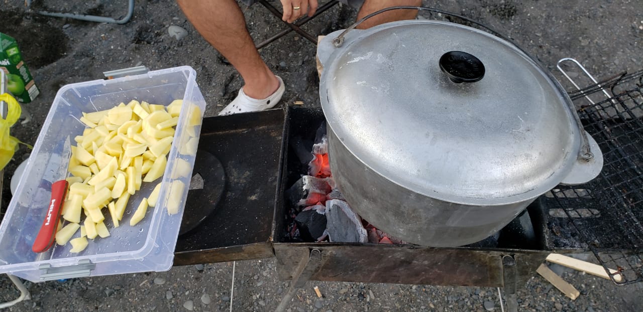Пообедали вкусным мясом с шикардоса, смотались еще раз на рыбалку, и приступили к подготовке ужина и бани. На ужин у нас планировался жаренный на углях окунь и настоящий походный борщ.